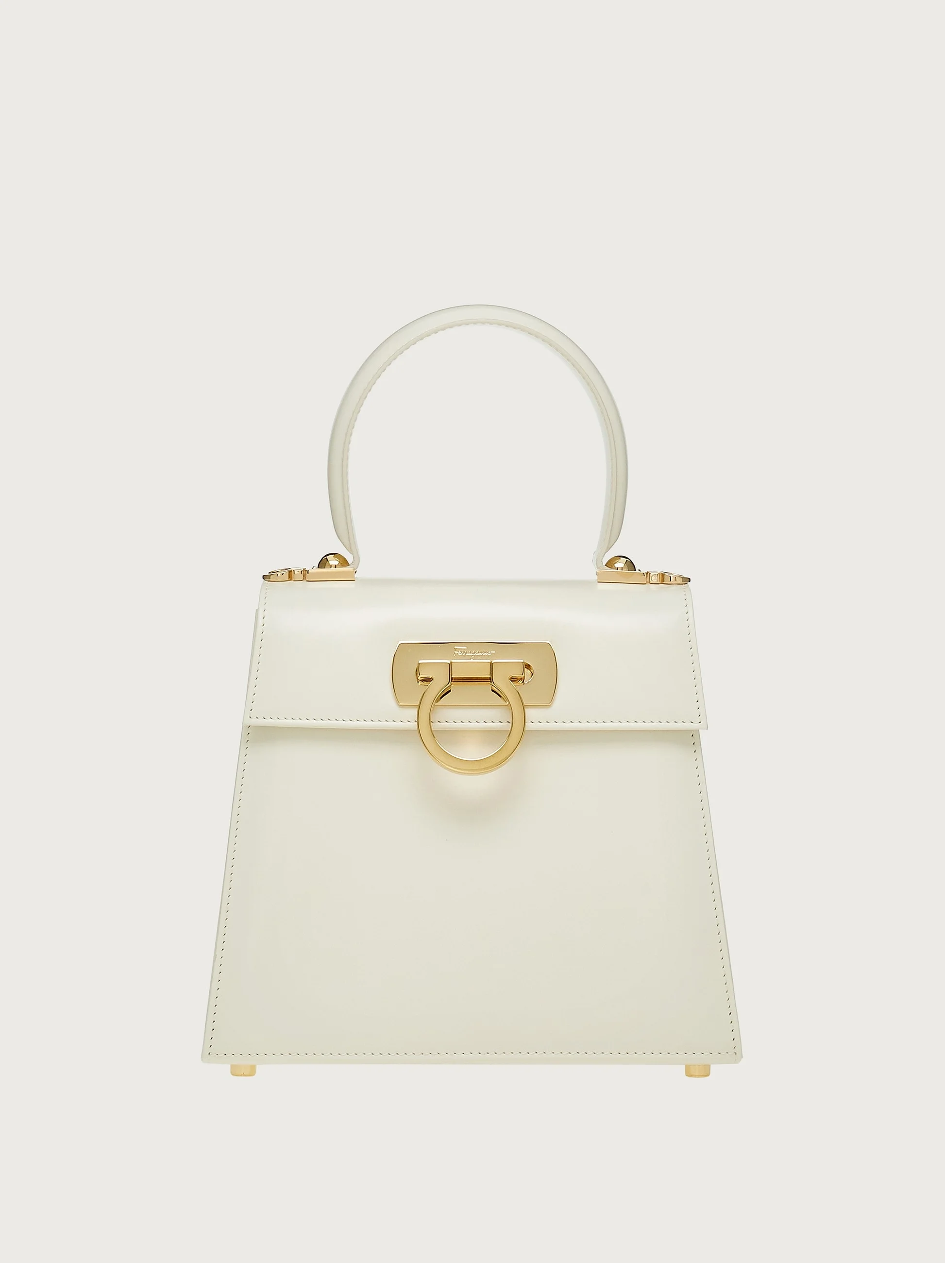 Small top handle bag in brushed-off calfskin with a gold Gancini clasp. Iconic Top Handle bag is a re-release of one of the Ferragamo brand’s best known styles and it embodies the many facets of the female essence. Its extremely versatile size makes it the perfect companion for any occasion. - A) Height 7.0 IN B) Length 8.0 IN C) Width 3.9 IN - Composition: brushed-off calfskin - Handle drop: 3.9 in/10 cm - Small - Made in ITALY - Product code: 212193 749023