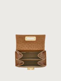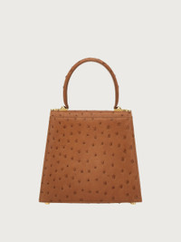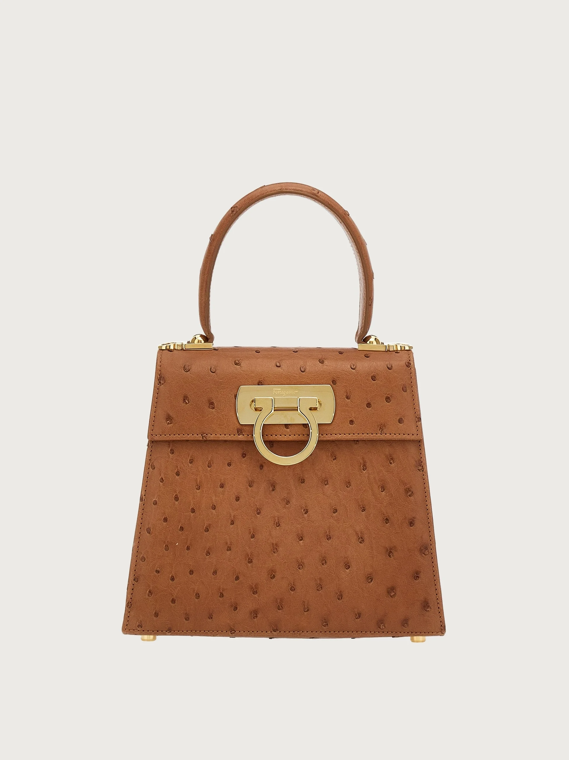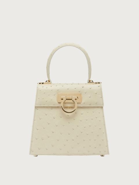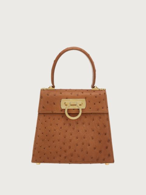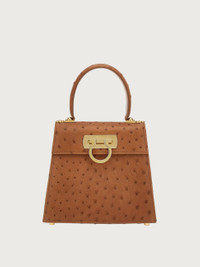 Small top handle bag in ostrich with a gold Gancini clasp. Iconic Top Handle bag is a re-release of one of the Ferragamo brand’s best known styles and it embodies the many facets of the female essence. Its extremely versatile size makes it the perfect companion for any occasion. - A) Height 7.0 IN B) Length 8.0 IN C) Width 3.9 IN - Composition: ostrich - Handle drop: 3.9 in/10 cm - Small - Made in ITALY - Product code: 212270 689934