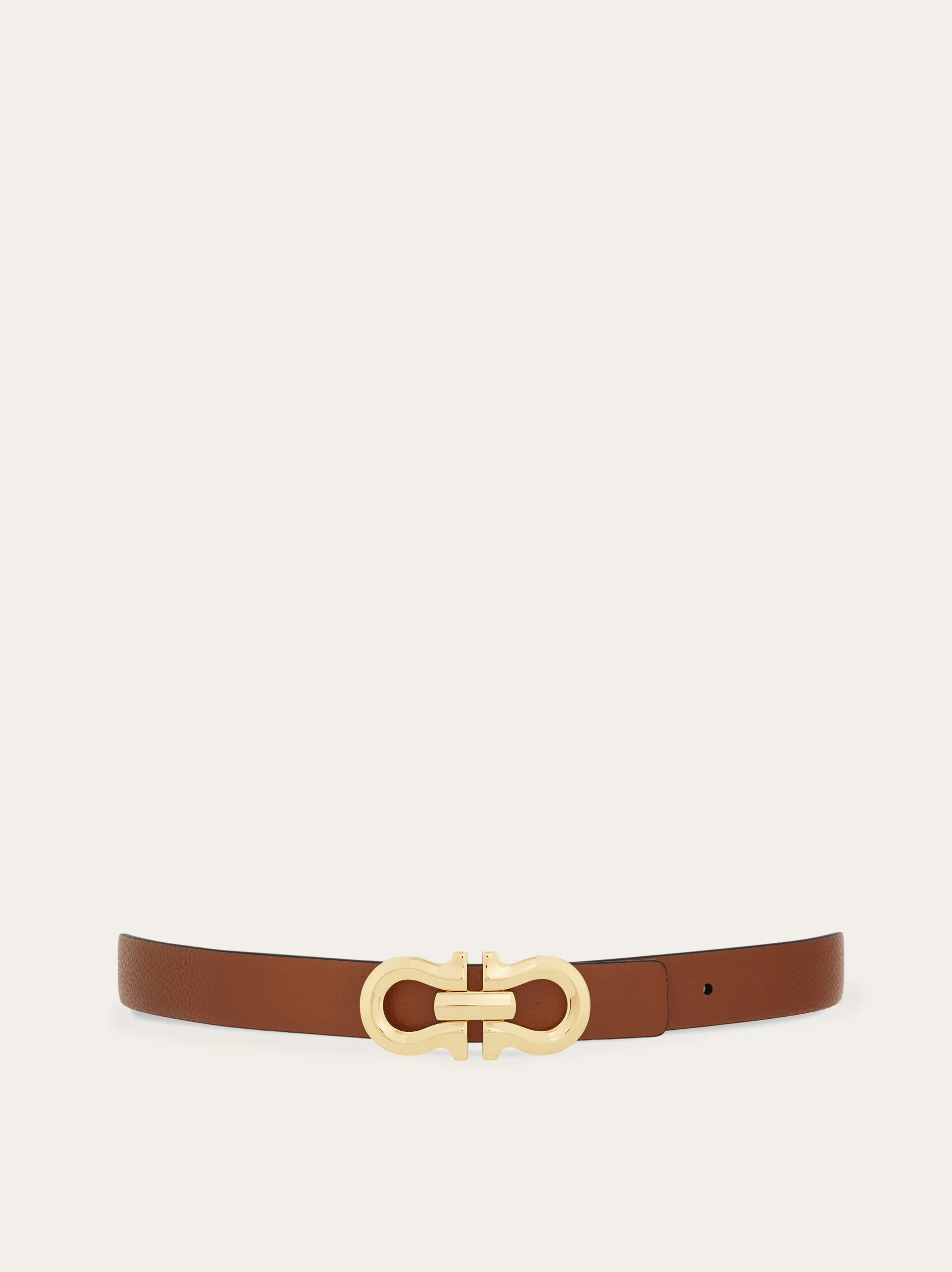 Metropolitan flair and golden touches define this new Ferragamo belt. Crafted from hammered calf leather, it features a reversible two-tone construction that allows for multiple styling options. The stylized Gancini silhouette buckle adds a touch of elegance to the design. - height 0.9 IN - Composition: hammered calfskin - Made in ITALY - Product code: 230329 775597