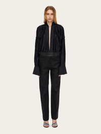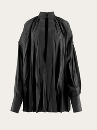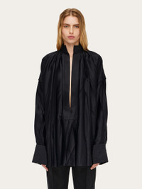 Irregular pleats and ethereal viscose satin bring an elegant allure to this kaftan shirt. Loose fitting with a deep v opening at the front, it has a raised collar with parallel stitching and a small Gancio fastening. Double stitching on the armhole and extra long cuffs with custom horn button echo a luxurious appeal. - Composition: 96% viscose, 4% elastane - Model measurements: Height 5' 10"/178 cm; Bust 31½ "/80 cm; Waist 23½"/60 cm; Hips 34 "/88 cm - Model wearing: 38 - Made in ITALY - Product code: 13E829 773251