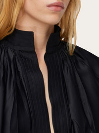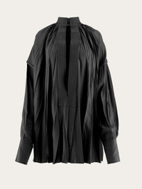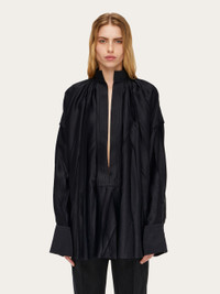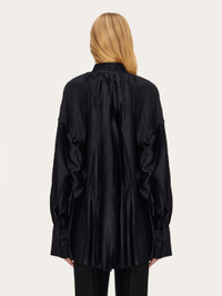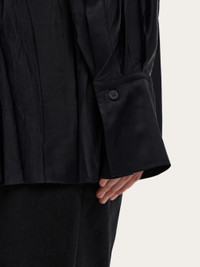 Irregular pleats and ethereal viscose satin bring an elegant allure to this kaftan shirt. Loose fitting with a deep v opening at the front, it has a raised collar with parallel stitching and a small Gancio fastening. Double stitching on the armhole and extra long cuffs with custom horn button echo a luxurious appeal. Model measurements: Height 5' 10"/178 cm; Bust 31½ "/80 cm; Waist 23½"/60 cm; Hips 34 "/88 cm Model wearing: 38 - Composition: 96% viscose, 4% elastane - Product code: 13E829 773251 - Made in ITALY