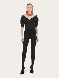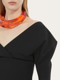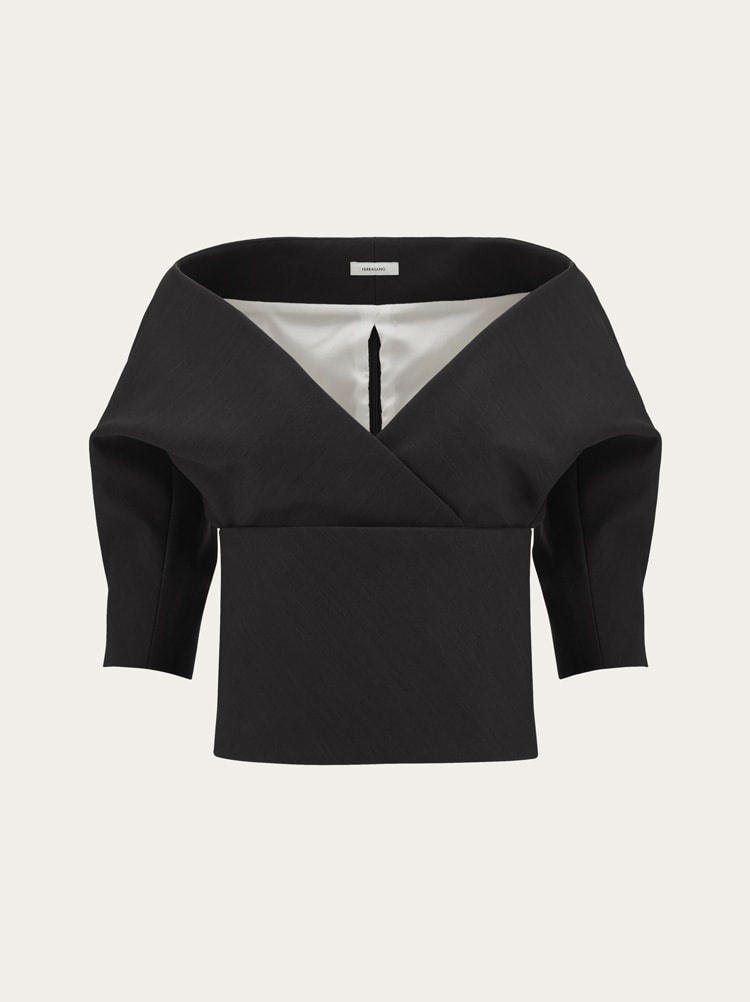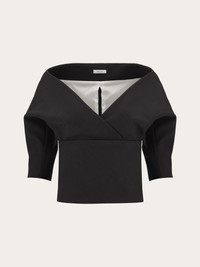 Contemporary silhouettes with classic inspiration, this modern take on the Bardot top is made of stretch wool gabardine, and features a deep V-neck. The kimono sleeves are voluminous at the shoulder and cut at the elbow. The empire seam under the bust features a basque waist to define the silhouette. - Composition: 69% wool, 23% nylon, 8% elastane - Made In ITALY