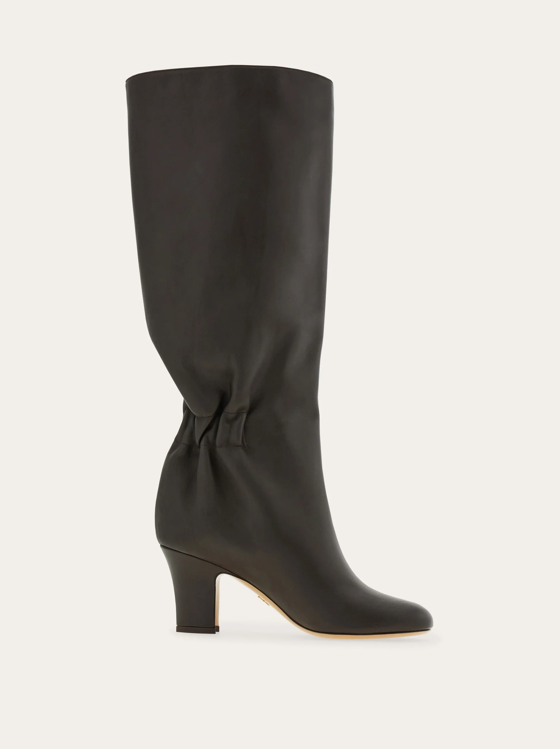 With its sophisticated, slouchy look, this knee boot promises to take your wardrobe in a stylish new direction. The square-toe profile is adorned with an oversized version of the Gancini motif in gleaming gold and set on a comfortable leather-covered block heel measuring 7 cm. - Composition: calfskin - Made in ITALY - Product code: 01K643 786903