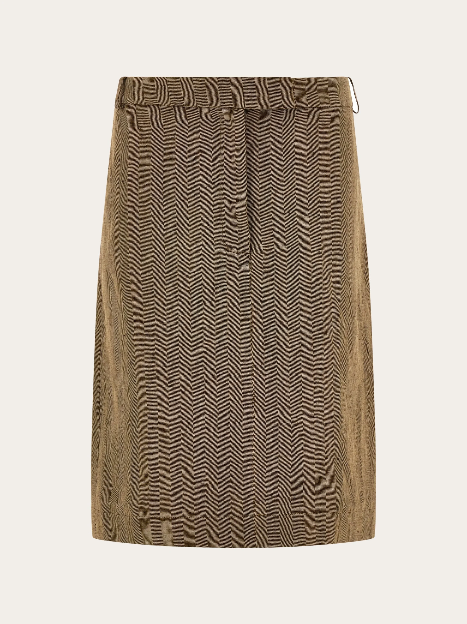 Herringbone, a classic pattern that echoes the depth and sophistication of this timeless pencil skirt. Inspired by the composed style of the 1940’s this knee length piece features an asymmetrical waistband, with side pockets and a single slit at the back. - Composition: 57% linen, 43% viscose - Made in ITALY - Product code: 13I101 793290