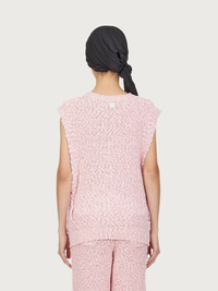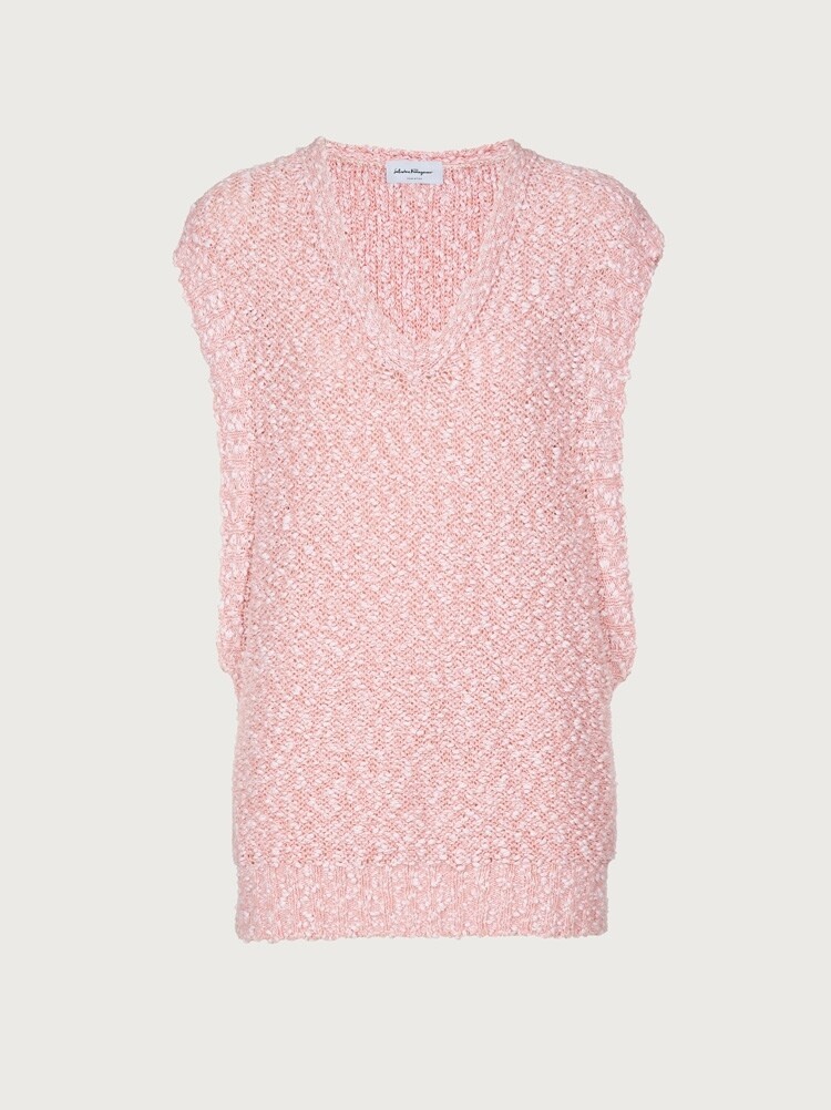 Laid back sleeveless knitted bouclé top with a sensual appeal. This versatile top is the ideal piece for summer days, easy, soft and comfortable, it has a V-neck and deep side slits under the arms that bring a contemporary sensuality. Details include two side slits and a leather Gancini patch at the back of the neck. Model measurements: Height 5' 11"/180 cm; Bust 31½"/79.5 cm; Waist 23½"/60 cm, Hips 34½"/87 cm - Composition: 100% cotton - Made In ITALY