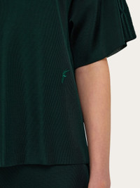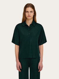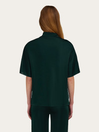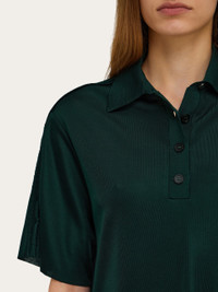 A classic silhouette revised in a sophisticated key, this short-sleeved polo is knitted from pure viscose. The impeccable drape of the fabric draws a contemporary silhouette with button-up collar and asymmetrical side slits. A tonal embroidered F completes the design. - Composition: 100% viscose - Model measurements: Height 5' 10"/178 cm; Bust 32 / 81cm; Waist 25"/63 cm; Hips 34½"/88 cm - Model wearing: 38/XS - Made in ITALY - Product code: 13H146 786226