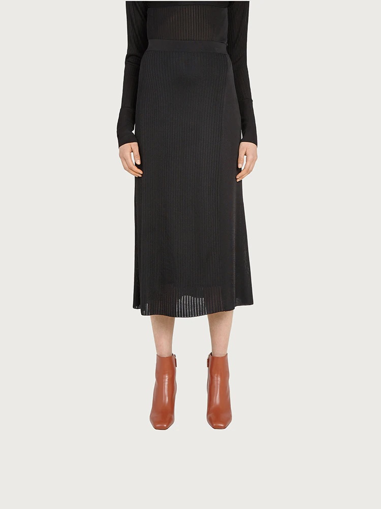 A harmonious combination of clean lines and innovative creativity defines this chic viscose knit skirt. Made from fibers derived from certified responsible forestry, the viscose imparts a lightness to this pleated skirt, that is enhanced by the fluid fit. The semi glossy finish on the fabric ensures a twist of glam that you can dress up or down according to your mood. Model measurements: Height 5'11"/180 cm, Bust 32"/81.5 cm, Waist 25½"/64.5 cm, Hips 34½"/87 cm - Composition: 100% viscose derived from certified responsible forestry - Made In ITALY