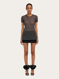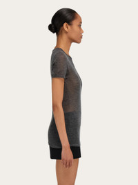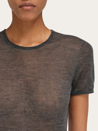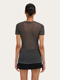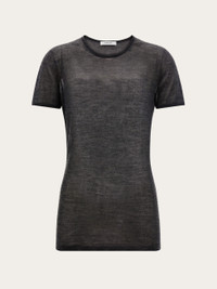 With its minimal silhouette made from a fine blend of wool and cashmere, this knitted crew neck T-shirt is ideal for luxurious layering. Its delicate transparency features a seamless outline with hand-applied trims on the neckline and sleeve edges. - Composition: 70% cashmere, 30% silk - Made in ITALY - Product code: 13H698 788106