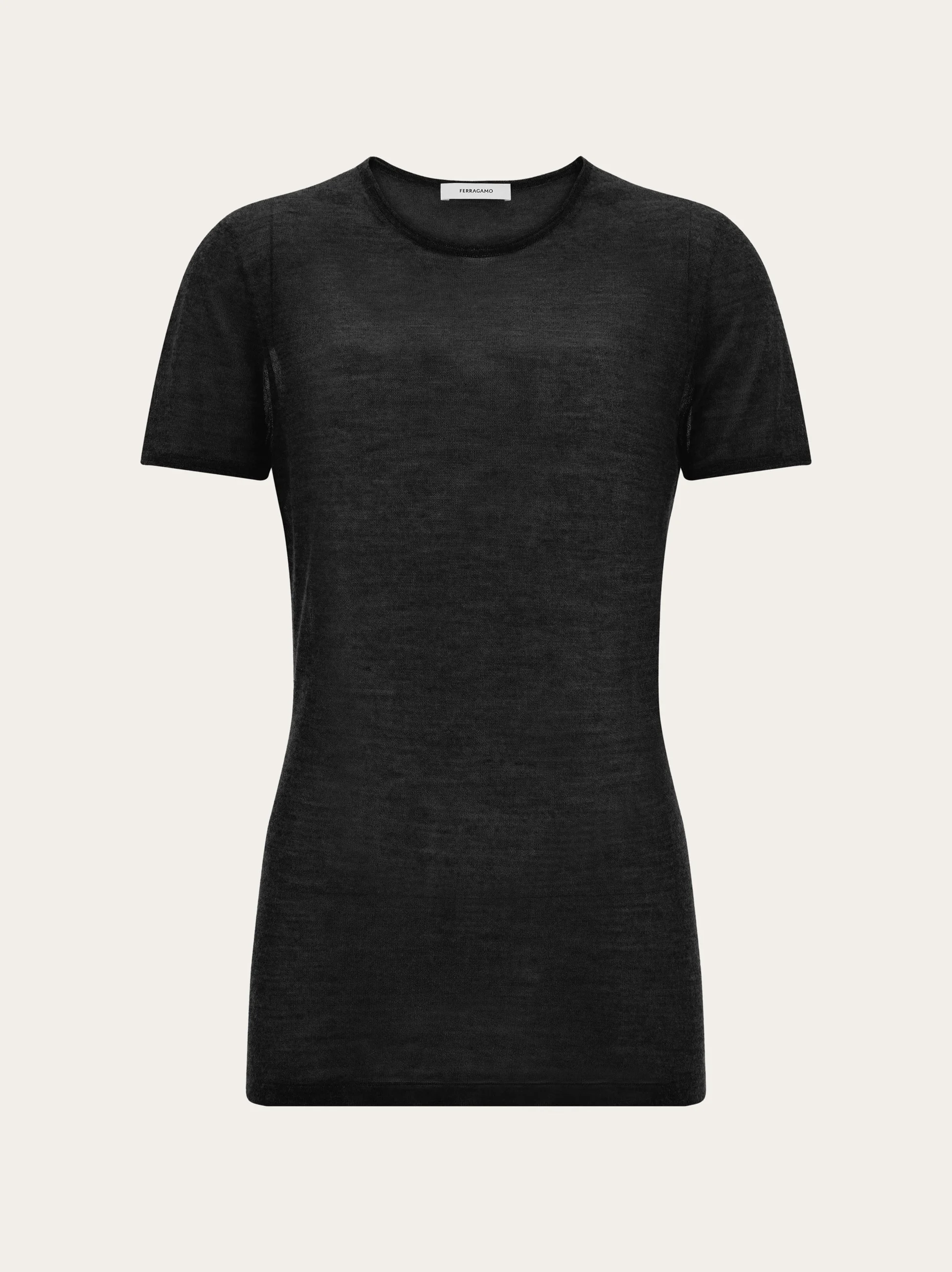 With its minimal silhouette made from a fine blend of wool and cashmere, this knitted crew neck T-shirt is ideal for luxurious layering. Its delicate transparency features a seamless outline with hand-applied trims on the neckline and sleeve edges. - Composition: 70% cashmere, 30% silk - Made in ITALY - Product code: 13H698 788105