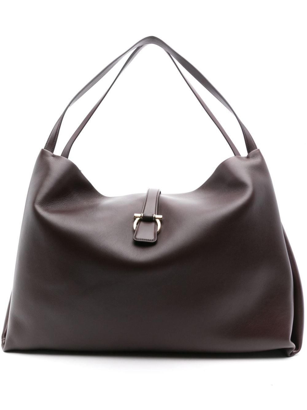 large Gancini-buckle shoulder bag Highlights - Cedar brown - Calf leather - Smooth grain - Magnetic fastening - Two top handles - Gancini buckle - Two flat shoulder straps - Main compartment - Internal zip-fastening pocket Made in Italy Composition Lining: Cotton 90%, Polyurethane 10% Outer: Calf Leather 100% SIZE & FIT Model measurements Height 5 ft 10 in(1.79 m) Bust/Chest 33.07 in(84 cm) Hips 37 in(94 cm) Waist 25.19 in(64 cm) Measurement DEPTH 5.9 in(15 cm) HEIGHT 13.77 in(35 cm) STRAP 24.01 in(61 cm) WIDTH 19.68 in(50 cm)