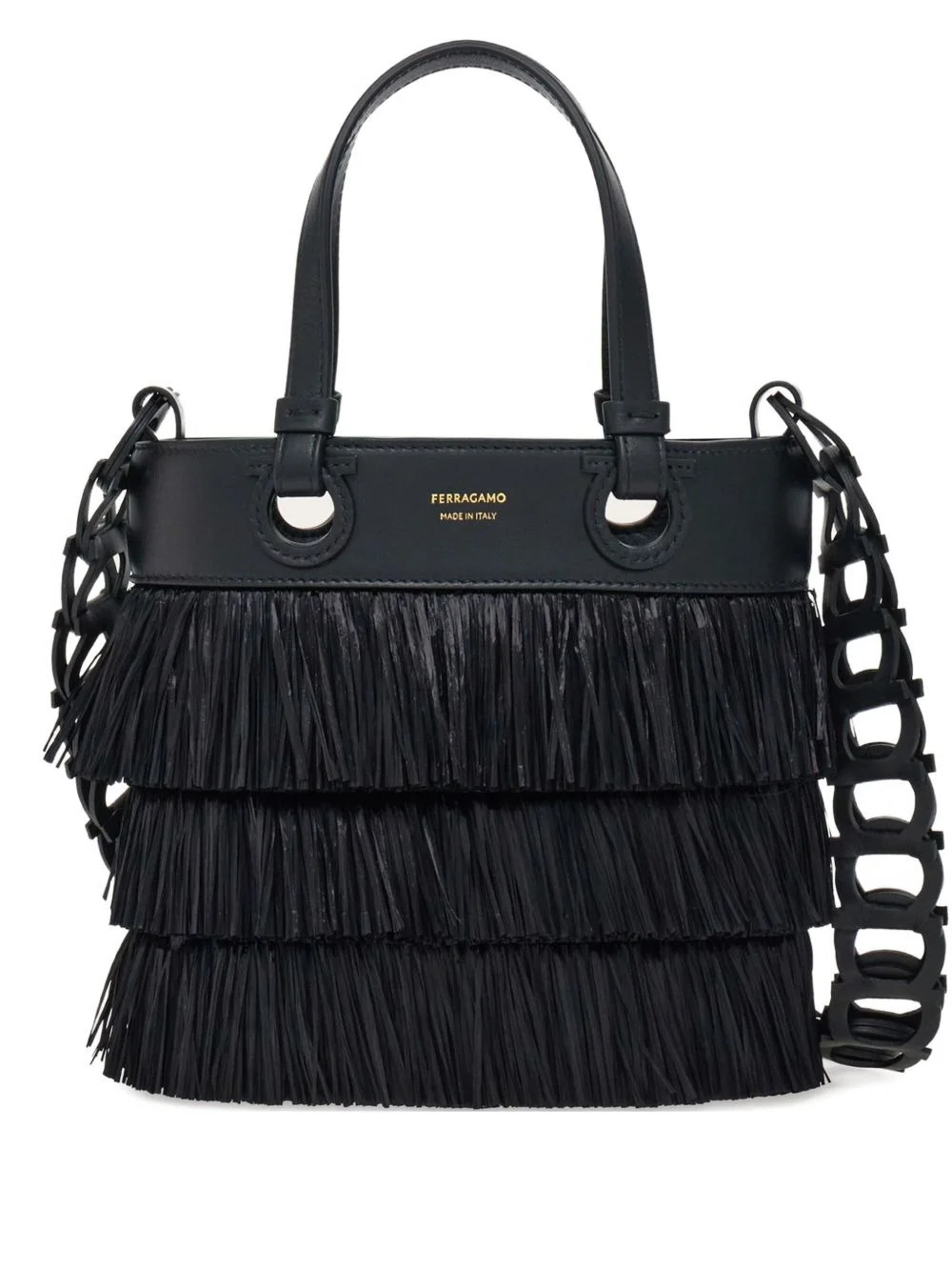 layered-fringe tote bag Highlights Made in Italy Composition Outer: Fabric 70%, CALFSKIN 30% SIZE & FIT Measurement STRAP 12.2 in(31 cm)