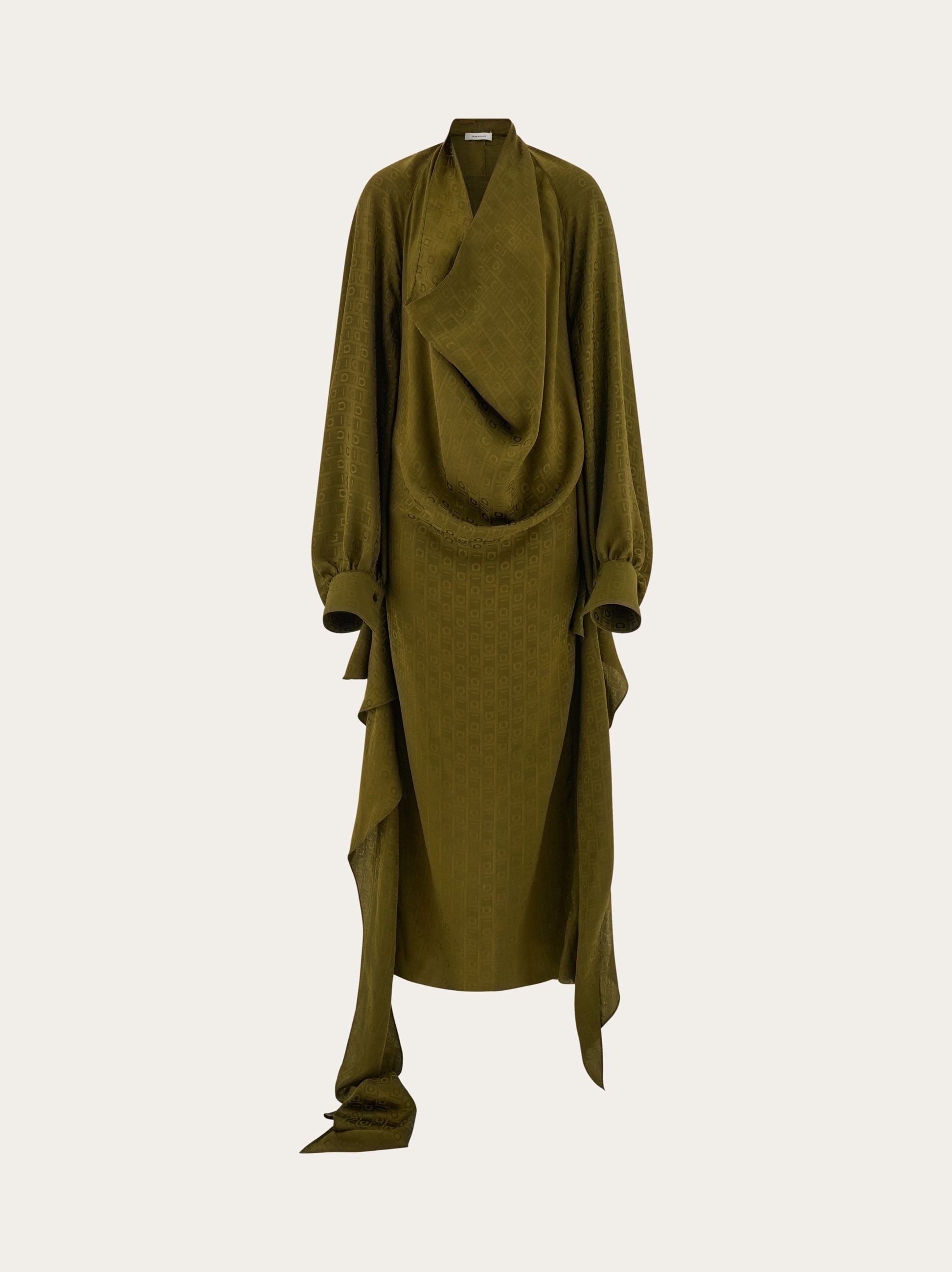 The billowing silhouette enhances the rich feel of this pure silk dress, featuring the all over Ferragamo monogram motif. The loose fitting top has a draped neckline, batwing sleeves with shirt cuffs, and a basque-effect sash to cinch the fit. The straight, ankle length skirt with back slit balances the proportions. - Composition: 100% silk - Model measurements: Height 5' 10"/178 cm; Bust 31½ "/80 cm; Waist 23½"/60 cm; Hips 34 "/88 cm - Model wearing: 38 - Made in ITALY - Product code: 13G490 780596