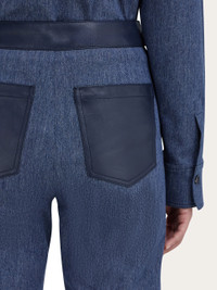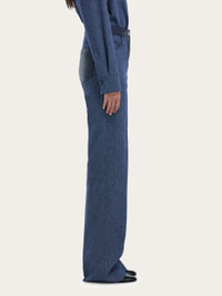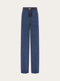 High rise soft stretch denim cut to a wide leg with ironed crease. Contrasting leather accents on the waistline and back pocket confirm an exclusive look, echoed by the matte Hug buckle at the waist. Off duty style with a high fashion feel. - Composition: 99% cotton, 1% elastane - Made in ITALY - Product code: 13H888 790227