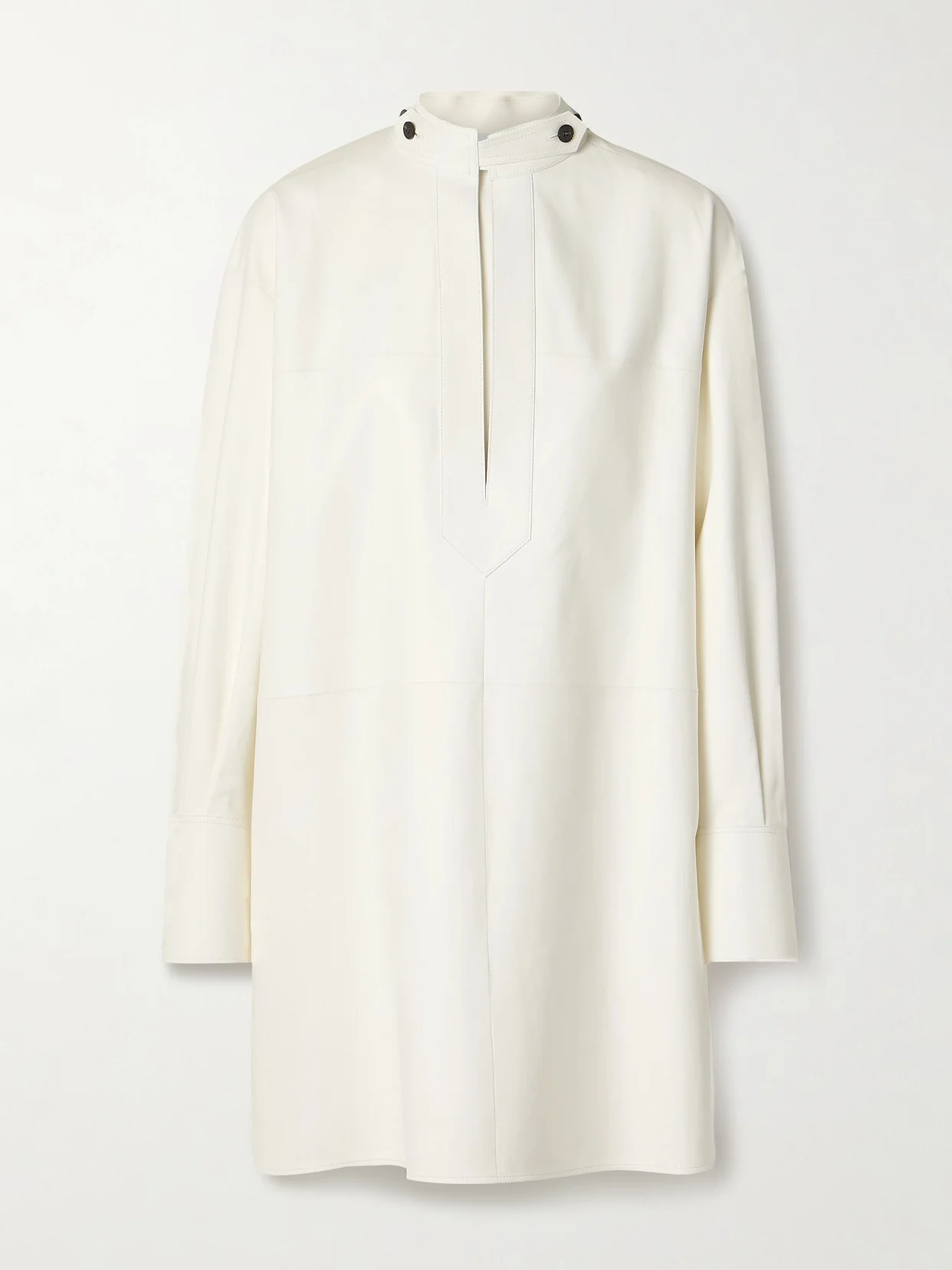 Ferragamo's leather tunic has a curved, high-low hem that hits mid-thigh, so you can easily style it as a mini dress too. It has a button-embellished stand collar with an adjustable tab and skin-baring placket.