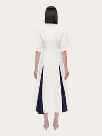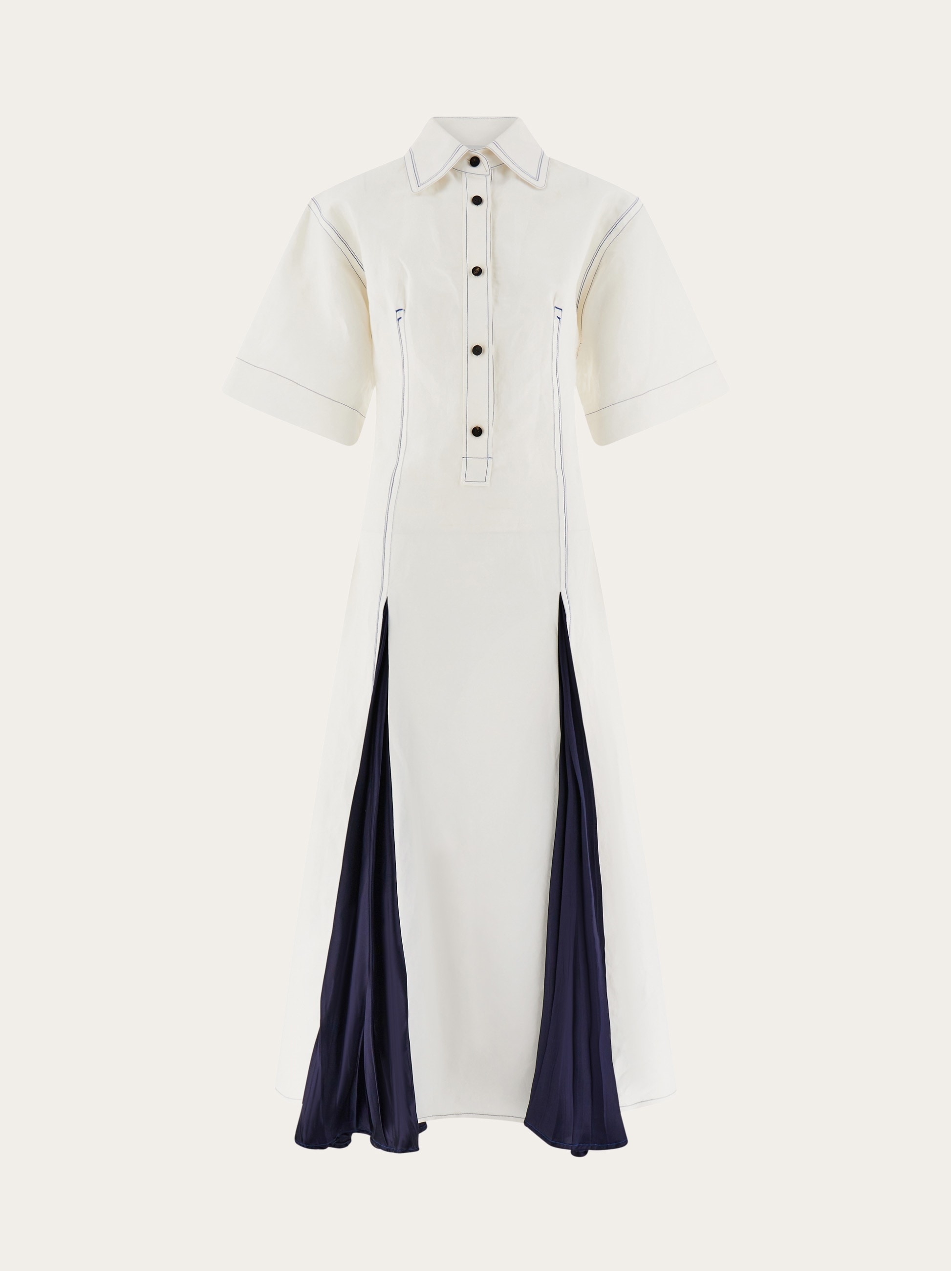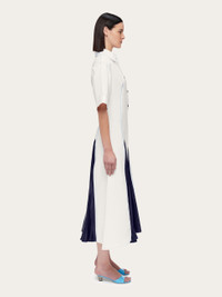 Flattering darts and eye catching inlays make this shirt dress truly unique. The collar, shoulders and sleeves imply a masculine shirt, which takes on a decidedly feminine feel as it is cinched by darts that begin at the bust, and widen all the way to the ankle length hem. Satin inlays at the front and back add volume to the flowing skirt, and the back zip ensures a comfortable fit. - Composition: 57% polyamide, 43% viscose - Made in ITALY - Product code: 13F486 775587