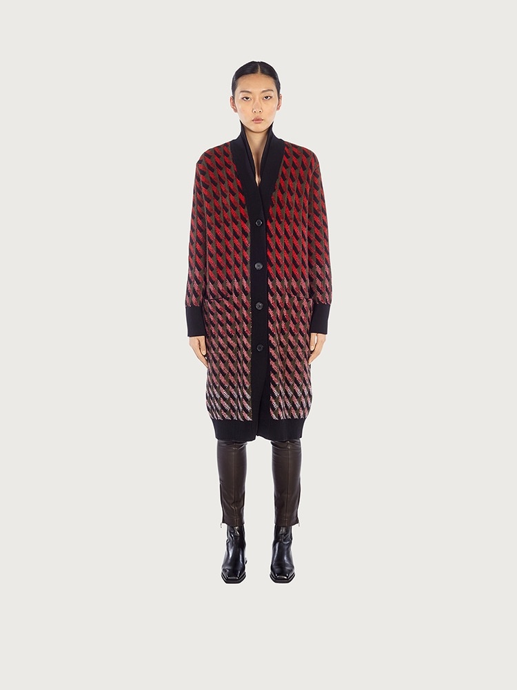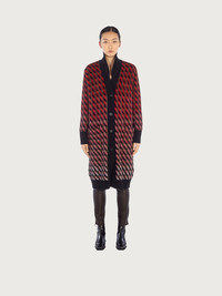 Elegant, feminine and ultra-versatile: the long cardigan struts into a new style season thanks to the refined jacquard workmanship and the dégradé pattern in intense seasonal shades. Contrasting edges and custom buttons add distinctive elements. The fit is relaxed, with patch pockets for an easy chic feel. Model measurements: Height 5' 10½ "/179 cm; Bust 30"/76 cm; Waist 23"/58.5 cm; Hips 35 "/89 cm - Composition: 70% pure virgin wool and 30% cashmere - Made In ITALY