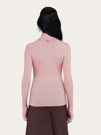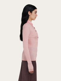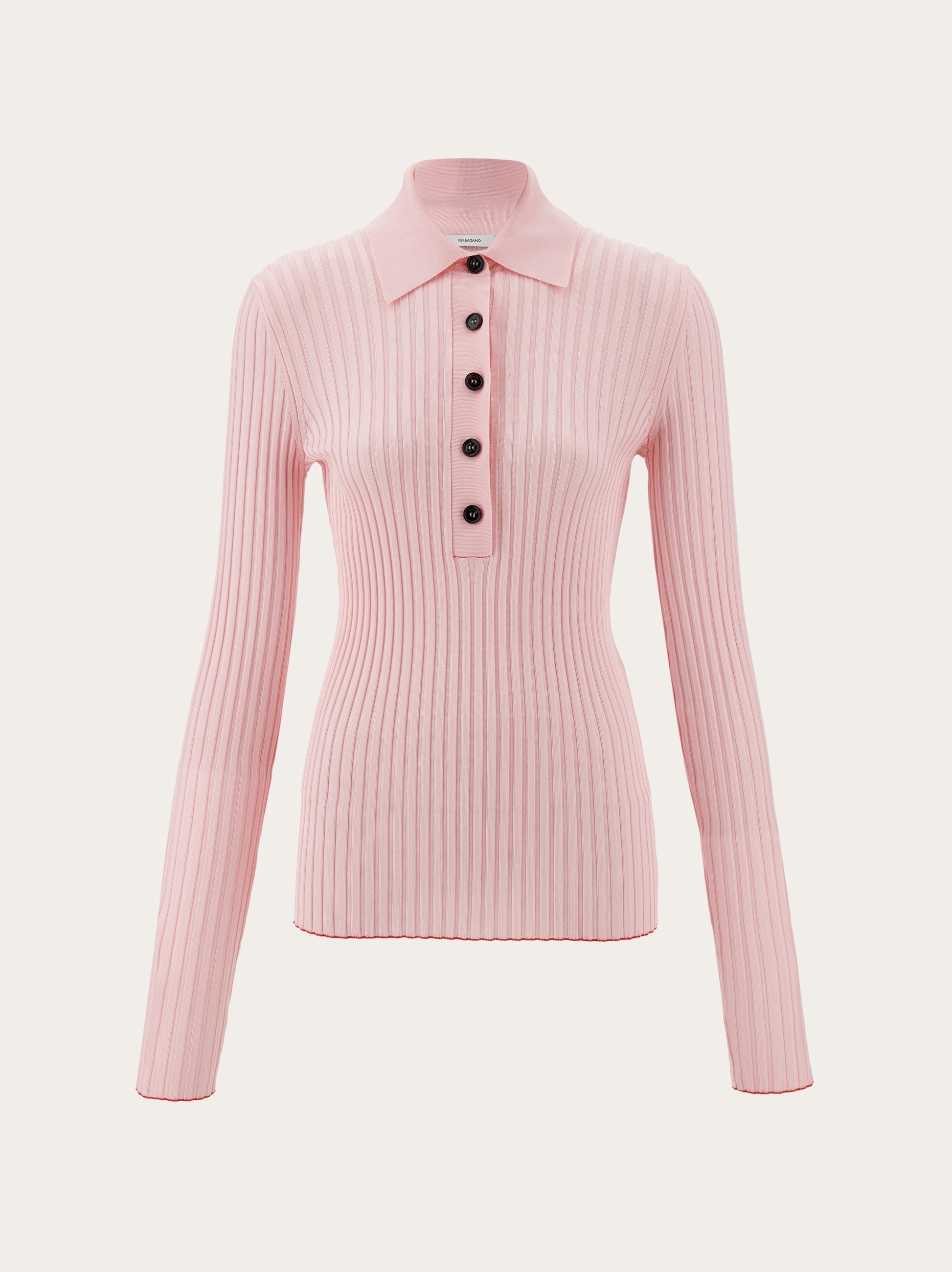 A current attitude and everyday comfort define this long-sleeved polo shirt made of stretch viscose. The slim fit features a ribbed knit finish that accentuates the outline, with custom buttons along the placket, and a custom metal tab at the back of the neck. Red stitching on the inside adds a discreet Ferragamo detail. - Composition: 90% viscose, 7% polyamide, 3% elastane - Model measurements: Height 5' 10"/178 cm cm; Bust 30½"/78 cm; Waist 23"/59 cm; Hips 35"/89 cm - Model wearing: XS - Made in ITALY - Product code: 113225 781190