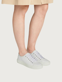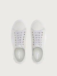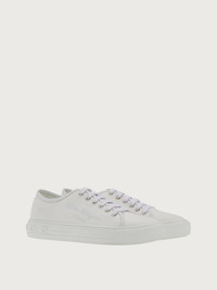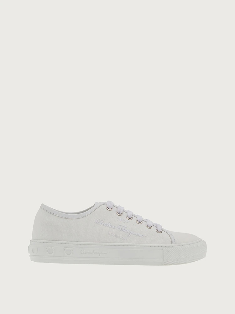 A stylish symbol of the Ferragamo commitment to environmental issues, this classic sneaker in pop colors is chic and unique. The upper is made of a mix of organic and recycled cotton, with leather finishes tanned with a chrome free process and logo realized with recycled TPU. The lining is made with cotton produced without agricultural and processing chemicals and the laces are in recycled post-consumer polyester. The soles are made with bio-based TPU content. Speaking of insoles, fussbett materials are realized with plant-based bio plastic, footbed bandage using recycled polyester and strobel felt contains post-consumer recycled polyester fibres. Eyelets in steel, recyclable metal, and sewing thread made from 100% post-consumer recycled polyester give the final touch. Impeccable sporty chic with a responsible soul. - Heel 1 cm - Composition: organic and recycled fabric - Made In ITALY