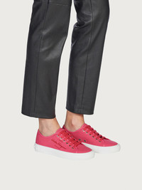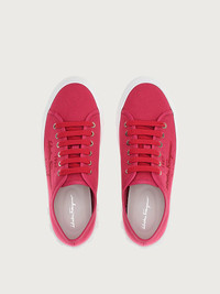 A stylish symbol of the Ferragamo commitment to environmental issues, this classic sneaker in pop colors is chic and unique. The upper is made of a mix of organic and recycled cotton, with leather finishes tanned with a chrome free process and logo realized with recycled TPU. The lining is made with cotton produced without agricultural and processing chemicals and the laces are in recycled post-consumer polyester. The soles are made with bio-based TPU content. Speaking of insoles, fussbett materials are realized with plant-based bio plastic, footbed bandage using recycled polyester and strobel felt contains post-consumer recycled polyester fibres. Eyelets in steel, recyclable metal, and sewing thread made from 100% post-consumer recycled polyester give the final touch. Impeccable sporty chic with a responsible soul. - Heel 1 cm - Composition: fabric - Made In ITALY