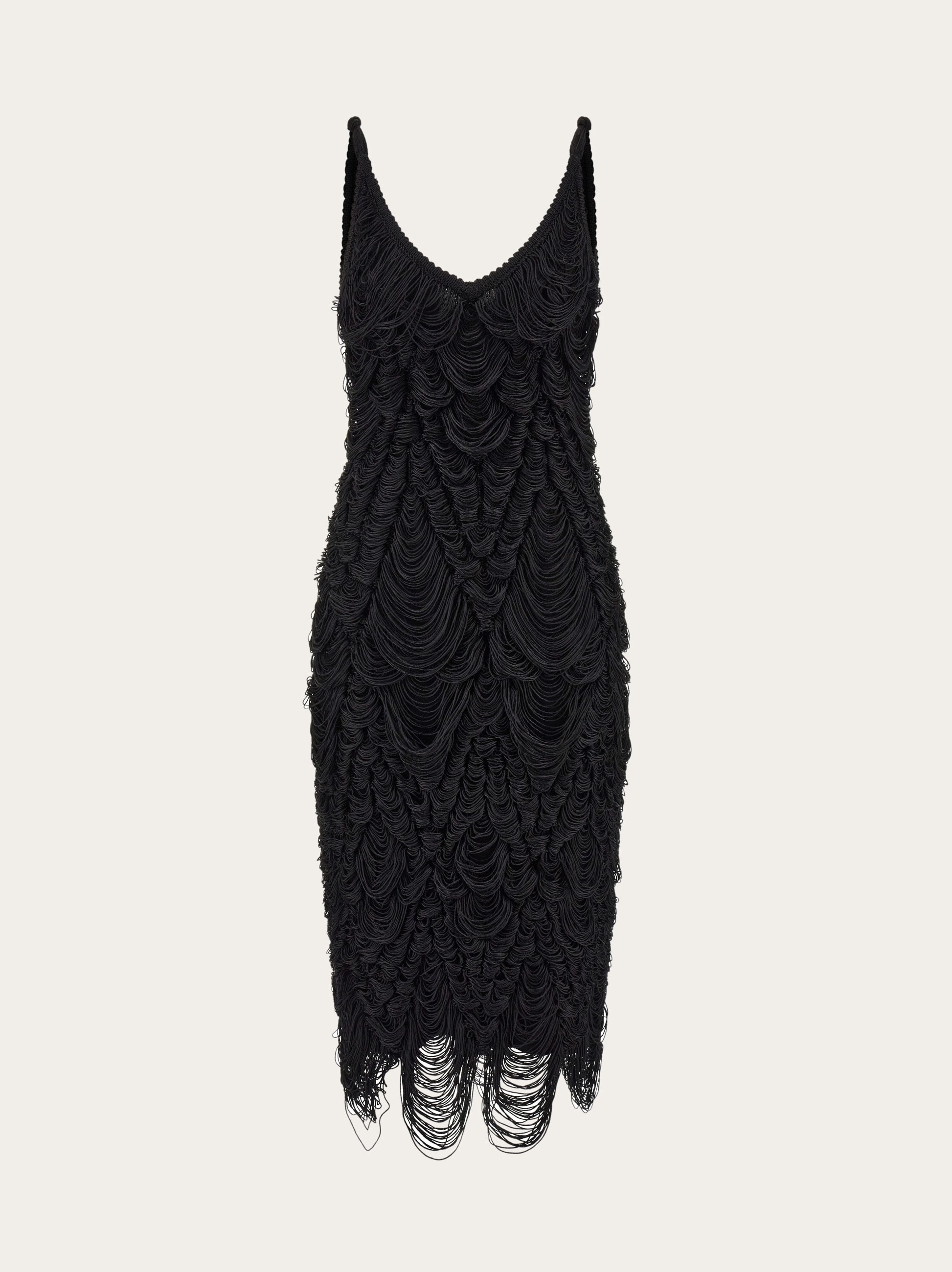 Star of this season’s show, this midi dress is meticulously crafted from an abundant array of silk cords, and ties at the neck with long fibers that dramatically drop to the ground. The viscose jersey ensures a comfortable yet figure hugging fit, while the long silk strands follow an irregular jacquard pattern, inspired by twenties designs. Voluminous ripples are made contemporary by the bold cut and rich feel of the fabric. - Composition: 70% silk, 22% viscose, 4% polyester, 3% polyamide, 1% elastane - Made in ITALY - Product code: 112954 778430