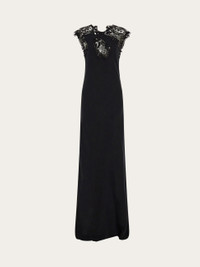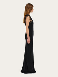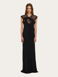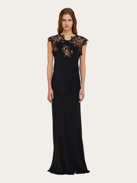 Silk and lace, a beloved combination revised in a sophisticated key. This long evening dress combines luxurious crepe de Chine with macrame lace trim along the neckline with deep V-cut at the back. The rich materials and elegant silhouette make this dreamy slip a total show stopper. - Composition: 100% silk - Model measurements: Height 5' 10"/178 cm; Bust 32 / 81cm; Waist 25"/63 cm; Hips 34½"/88 cm - Model wearing: 38/XS - Made in ITALY - Product code: 13H321 785506