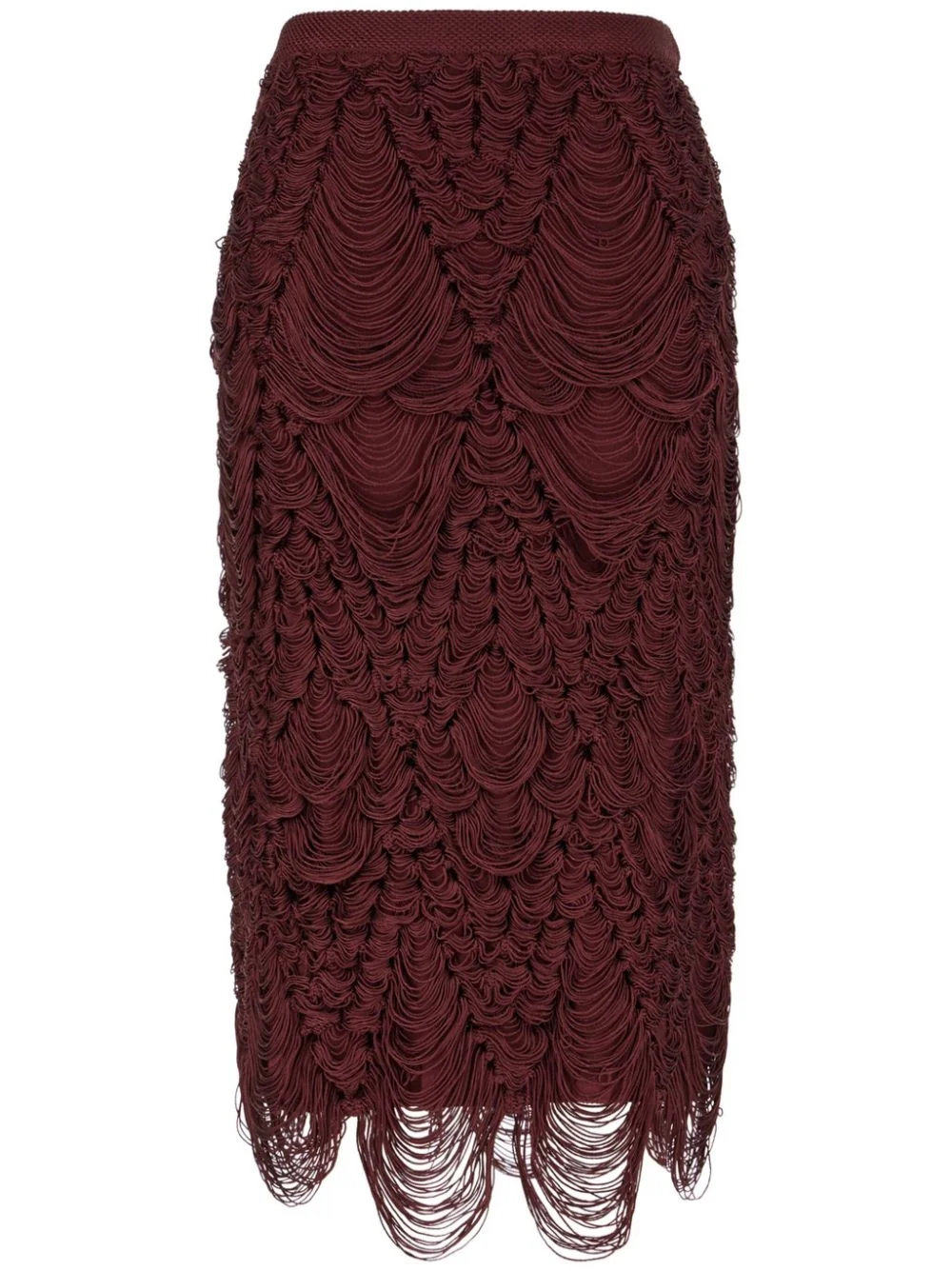 fringed midi skirt Highlights - Burgundy - Concealed rear zip fastening - High waist - Fringe detailing Made in Italy Composition Silk 70%, Viscose 22%, Polyester 4%, Nylon 3%, Elastane 1%