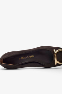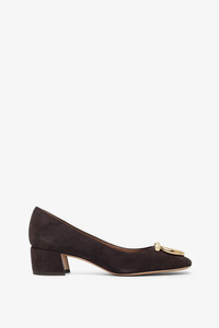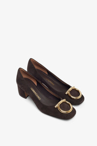 Dark brown suede pumps from Ferragamo. The Mara pumps are made of suede with a square toe, embellished with a logo-engraved Gancini medallion, set on a 40mm square block heel. - Leather sole - True to size - Made in Italy Product Code: 786972