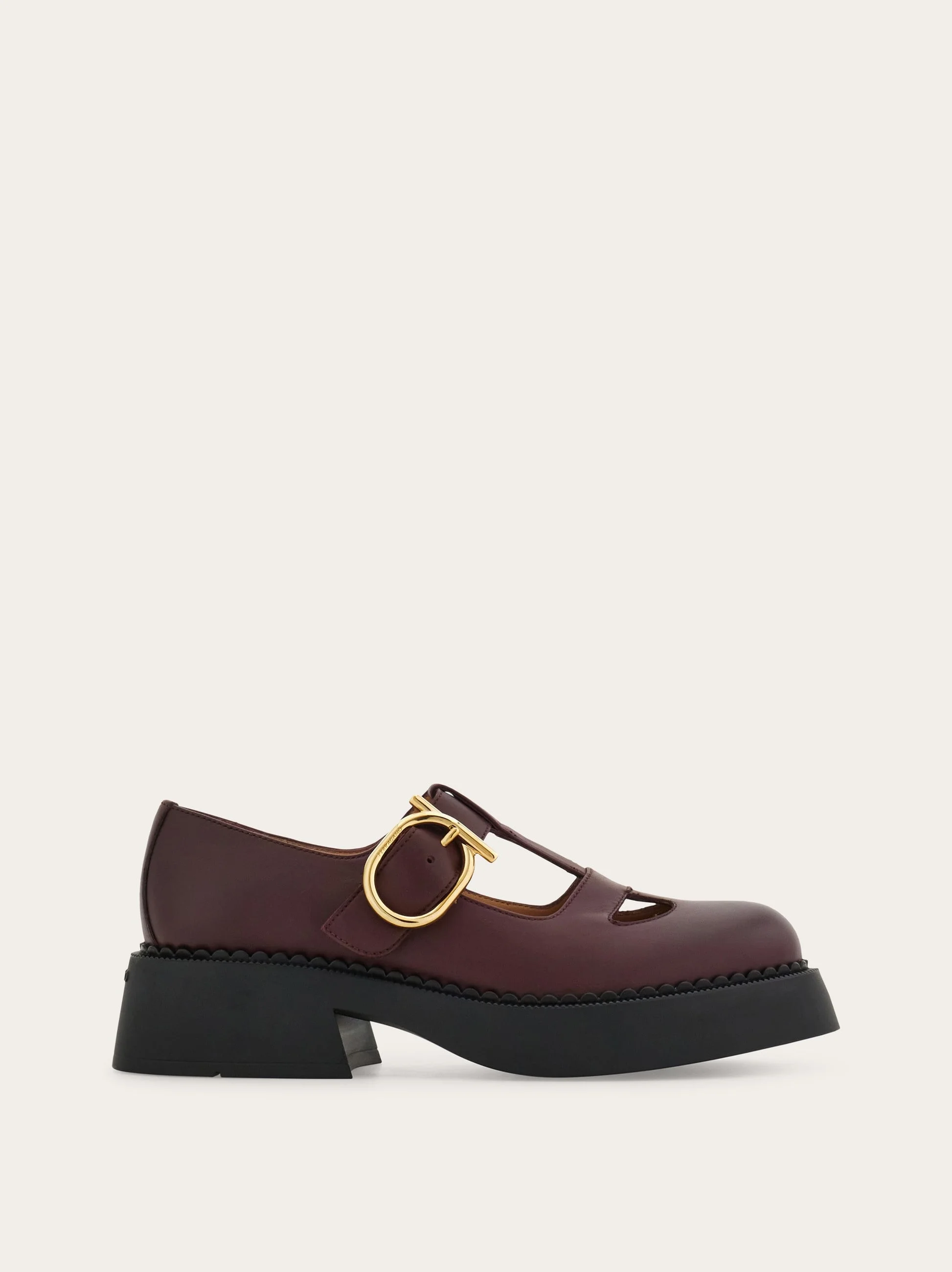 Sophisticated and cool: this Mary Jane loafer is designed with a round toe and an elegant T-strap fastened with the golden Gancini buckle decorating the side. It's set on a chunky rubber sole with a flared profile for an extra dose of attitude. - Composition: calfskin - Made in ITALY - Product code: 01K324 784762