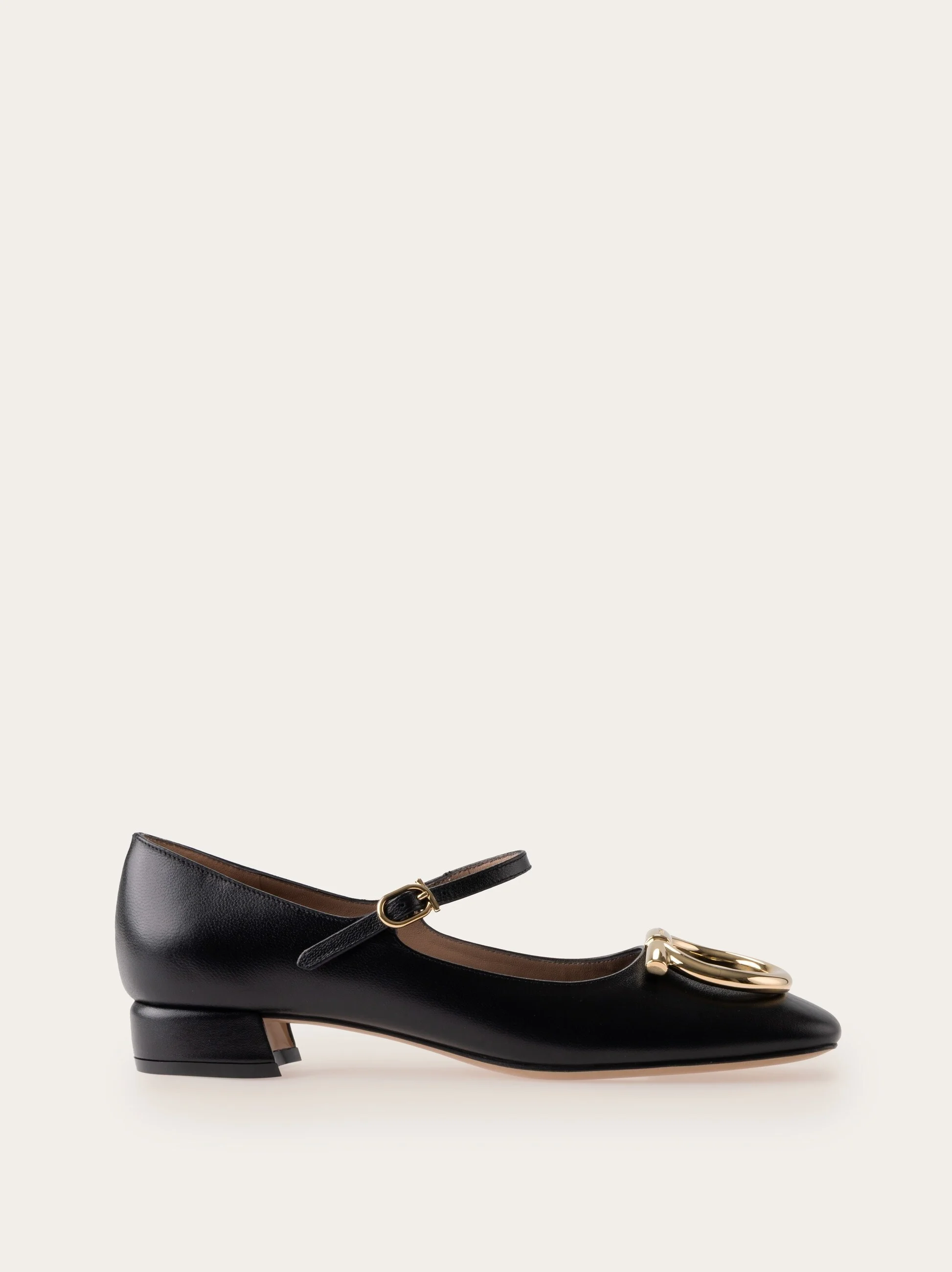 A harmony of contrasts: this new Mary Jane pump captures the essence of contemporary femininity envisioned by Maximilian Davis. The softly squared toe and tonal block heel nod to 60s fashion, while the maxi Gancini motif in gleaming gold adds a bold touch. - Composition: kidskin - Made in ITALY - Product code: 01K512 785219