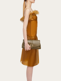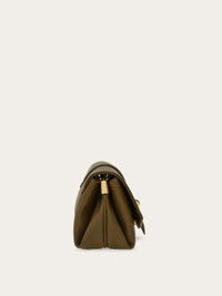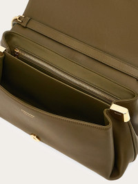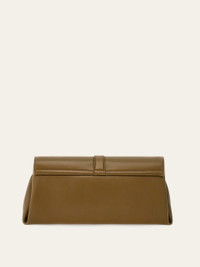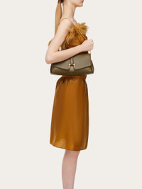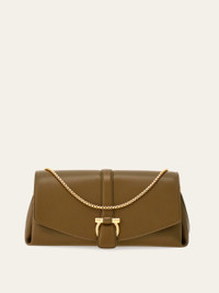 Effortlessly chic and easy to carry, this new Ferragamo cross body is a lesson in contemporary style. Cut from sumptuous Italian calfskin with a semi-gloss finish, the leather is punctuated by a golden Gancini clasp on the front flap. At the sides, custom golden tabs shape the bellows whose outline echoes the lily, the symbol of Florence. Carry as a clutch, shoulder bag or wear cross body with the adjustable, removable strap and golden chain. - height 6.2 IN length 12.2 IN width 4.3 IN - Composition: calfskin - Made in ITALY - Product code: 219794 777231
