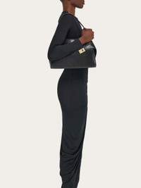 A harmonious blend of clean lines and distinctive accents define this take on the iconic Hug. The soft Hug bag by Ferragamo, an intriguing silhouette cut from washed calfskin leather with golden hardware and a fully organized interior with central zip. Adjustable, removable shoulder strap. - A) Height 10.0 IN B) Length 13.3 IN C) Width 6.1 IN - Composition: washed calfskin - Handle drop: 7.2 in/18,5 cm - Medium - Made in ITALY - Product code: 219816 787833