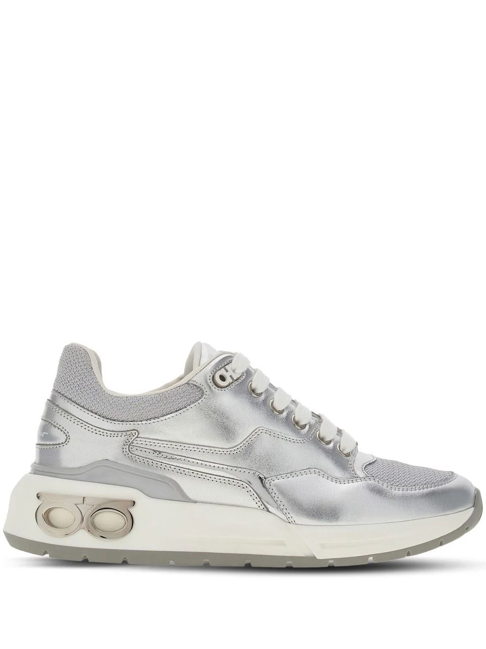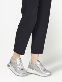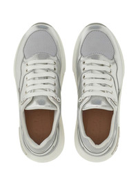 leather sneakers Highlights - Silver-tone - Leather - Metallic finish - Panelled design - Round toe - Logo patch to the side - Front lace-up fastening - Branded insole - Flat rubber sole Made in Italy Composition Outer: CALFSKIN 80%, Fabric 20% Sole: Rubber 100% Lining: Fabric 100%