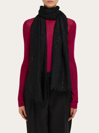 A shower of light to be worn draped around the neck, over the shoulders, or lying on the side: the new cashmere and silk stole is decorated with micro sequins embedded in the fabric, which maintains a surprising softness to the touch. The light version for daytime, and the dark elegant one for evening. - length 78.7 IN width 27.5 IN - Composition: 61% cashmere, 26% silk and 13% polyester - Made in ITALY - Product code: 320952 781474