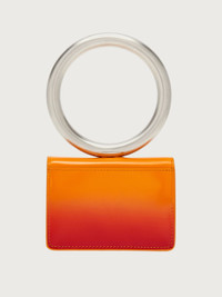 Made of soft calf leather, with a front flap and snap button clasp, this micro pouch features a rigid top handle shaped like a bangle. The metallic handle has a matte finish for a contemporary flavor. - height 19.0 CM / 7.4 IN length 11.0 CM / 4.3 IN width 2.5 CM / 0.9 IN - Composition: calfskin - Product code: 220427 760657 - Made in ITALY