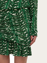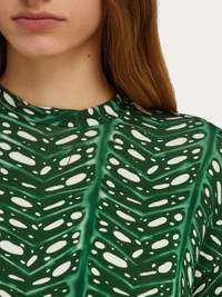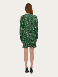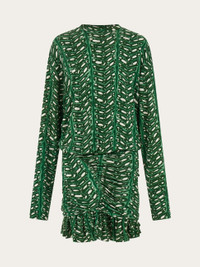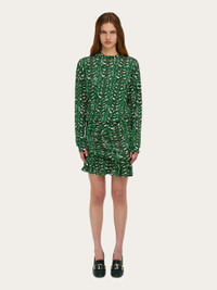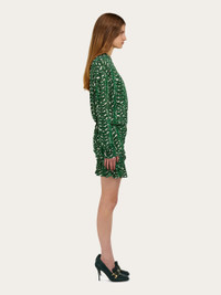 The lush charm of the palm print gives this mini dress a vibrant feel. The construction is a succession of feminine details with a slim fit, batwing sleeves and a gathered peplum with lateral ogee panel. Double fabric softens the drape along the entire length. - Composition: 95% viscose, 5% elastane - Model measurements: Height 5' 10"/178 cm; Bust 32 / 81cm; Waist 25"/63 cm; Hips 34½"/88 cm - Model wearing: 38/XS - Made in ITALY - Product code: 13H431 785976
