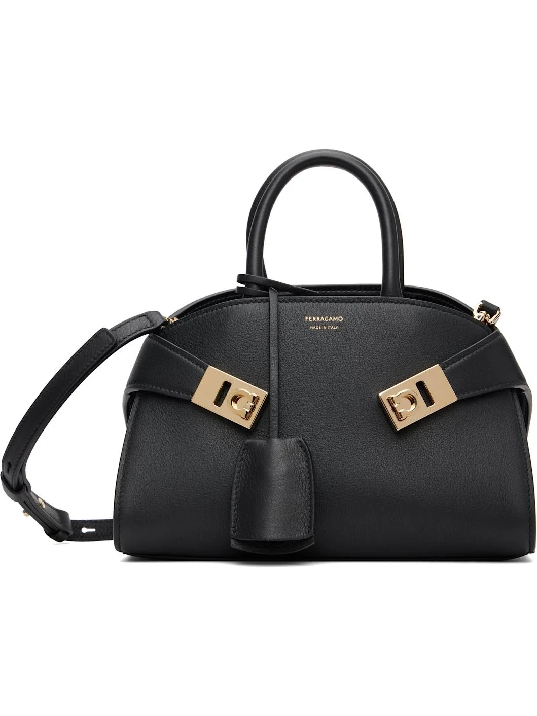 Vegetable-dyed hammered calfskin top handle bag. · Twin rolled carry handles · Adjustable and detachable crossbody strap · Detachable sheathed keyring at handle · Logo stamp at face · Flip-clasp strap at sides · Open throat · Two card slots at interior · Buffed leather lining · H5.5" x W9" x D5" Supplier color: Black Calfskin. Made in Italy 252270F046011