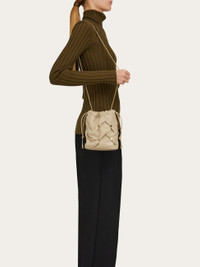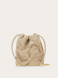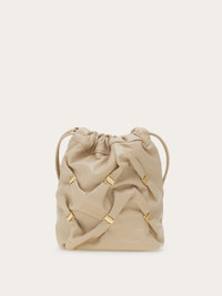 The soft, unstructured bucket shape is perfect for this design in supple nappa leather with draped details secured by mini Vara bows. Ideal for the most glamorous looks, it features a drawstring closure and a metallic shoulder strap. The lined interior offers just enough space for the essentials. - height 8.6 IN length 7.8 IN width 1.5 IN - Composition: nappa - 2 card slots, 1 compartment - Mini - Made in ITALY - Product code: 220838 780183