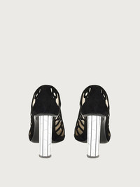 Feminine and gritty, with a sensual undertone: these pumps are for the lady who is really in touch with her style. The micro mesh construction combines perfectly with an elegant, perforated suede cut in a high frequency technique that draws Gancini outlines and geometric shapes. The soaring heel is a beautiful column of mirrors with a cracked effect that implies a touch of grit. Be prepared to turn heads. - Heel 10,5 cm - Composition: calf suede and micromesh - Made In ITALY