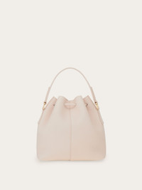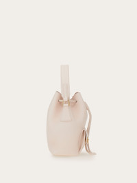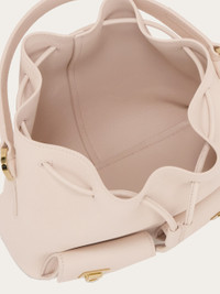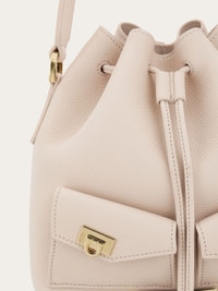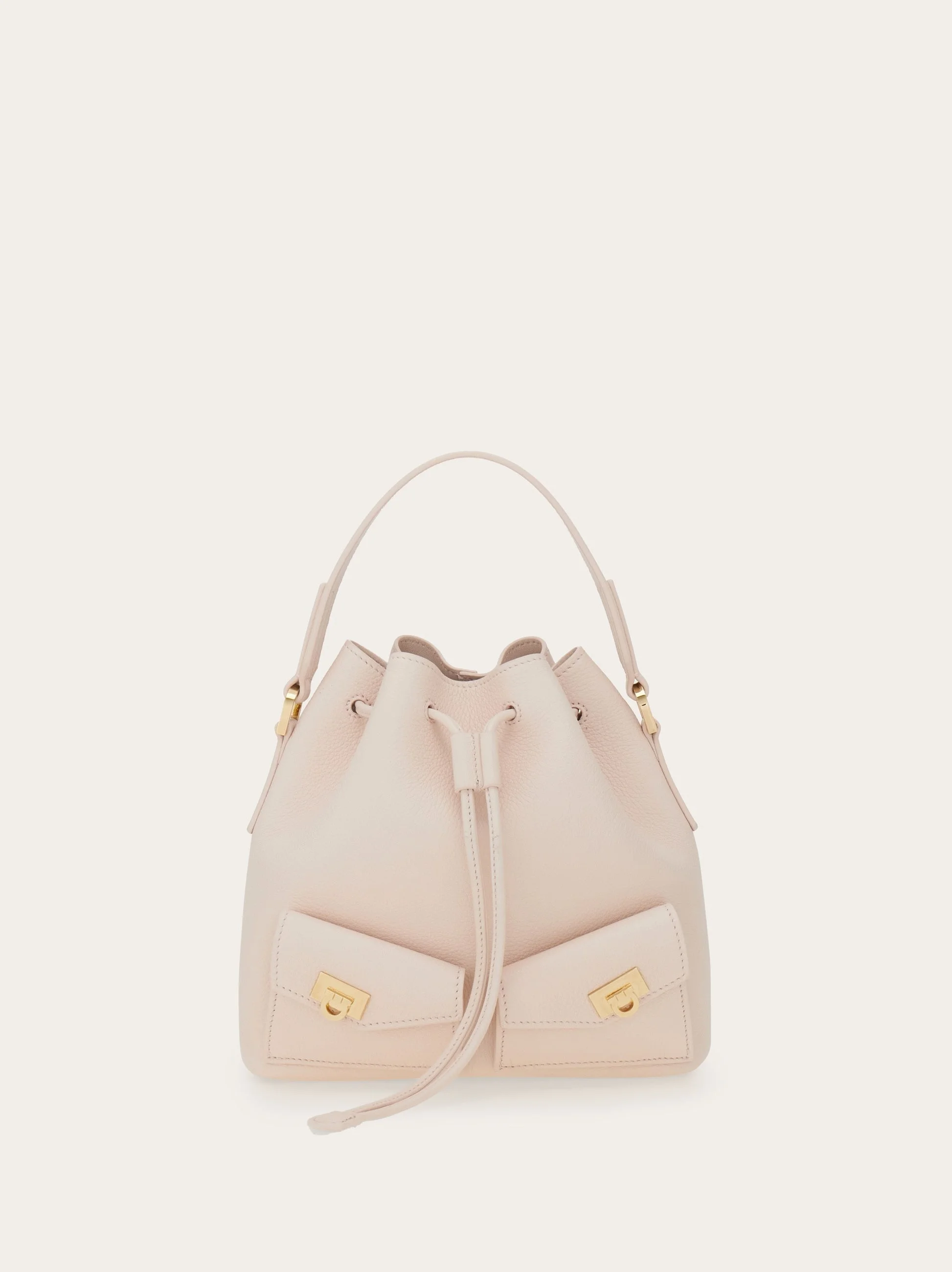 Small in size, big on style—this mini bucket bag blends sleek design with soft, textured leather. Front pockets accented by the Hug buckle add a signature touch, while the drawstring closure, top handle, and adjustable shoulder strap make it a versatile choice for on-the-go city days. - height 7.6 IN length 7.4 IN width 4.5 IN - Composition: hammered calfskin - Handle drop: 3.5 in/9 cm - Made in ITALY - Product code: 220915 785881