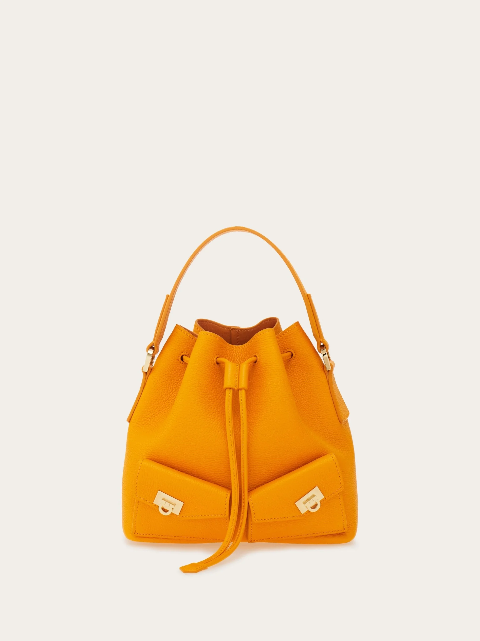 Small in size, big on style—this mini bucket bag blends sleek design with soft, textured leather. Front pockets accented by the Hug buckle add a signature touch, while the drawstring closure, top handle, and adjustable shoulder strap make it a versatile choice for on-the-go city days. - height 7.6 IN length 7.4 IN width 4.5 IN - Composition: hammered calfskin - Handle drop: 3.5 in/9 cm - Made in ITALY - Product code: 220915 785880