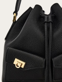 Small in size, big on style—this mini bucket bag blends sleek design with soft, textured leather. Front pockets accented by the Hug buckle add a signature touch, while the drawstring closure, top handle, and adjustable shoulder strap make it a versatile choice for on-the-go city days. - height 7.6 IN length 7.4 IN width 4.5 IN - Composition: hammered calfskin - Handle drop: 3.5 in/9 cm - Made in ITALY - Product code: 220915 785878
