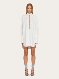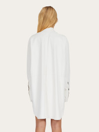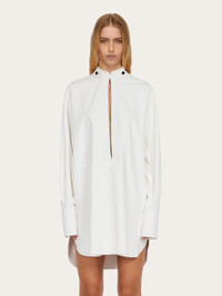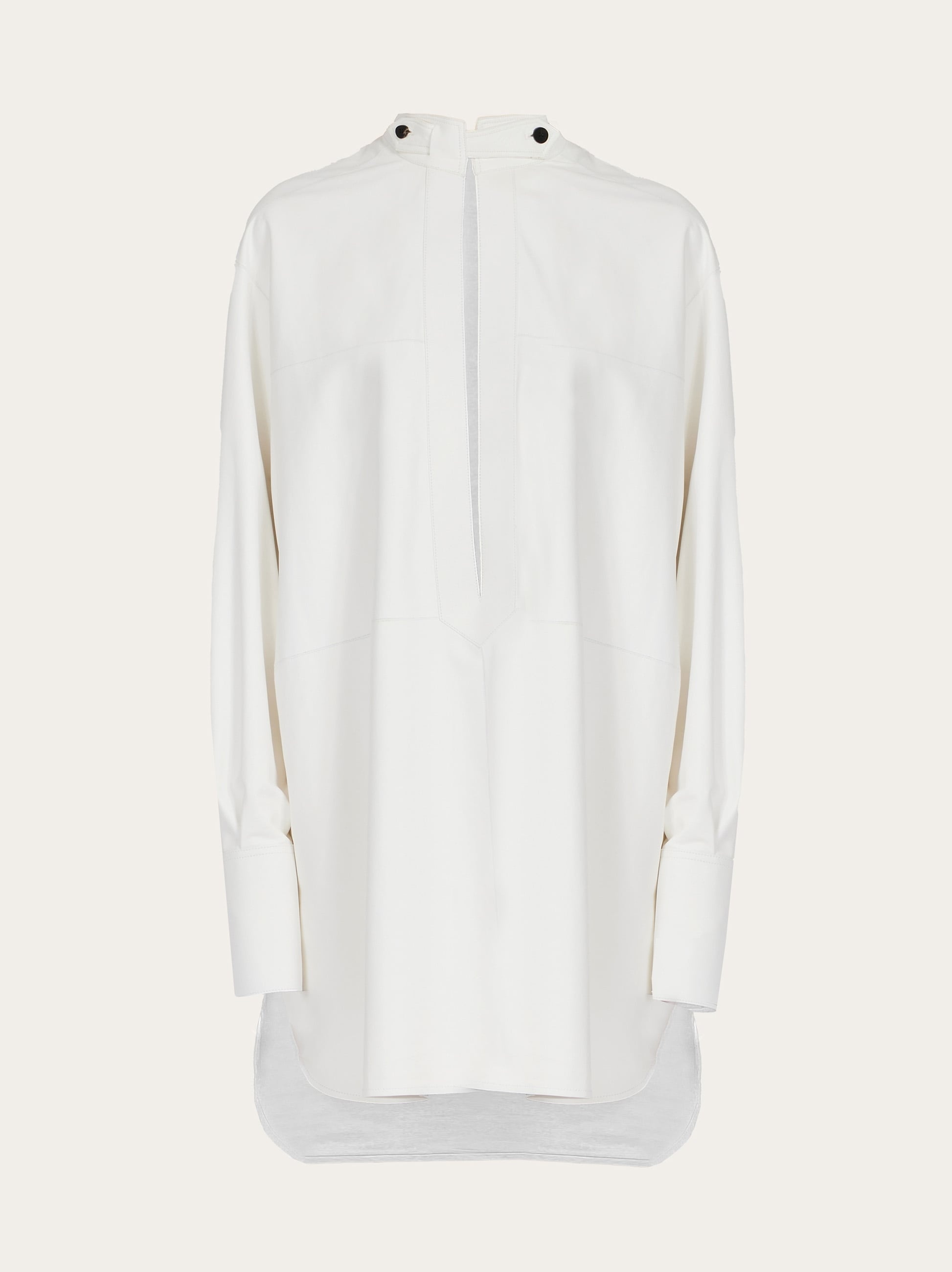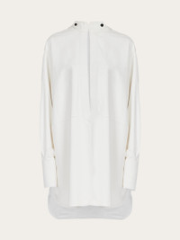 Renowned internationally for their mastery in leather craftsmanship, Ferragamo strike again with contemporary leather kaftan. Rich and sumptuous, it is cut from the finest nappa leather with a mandarin collar that fastens via an overlapping tab and a button on either side. The deep V neck echoes its sensual appeal, complemented by long sleeves with double height cuffs and an asymmetrical back. - Composition: nappa - Model measurements: Height 5' 10"/178 cm; Bust 31½ "/80 cm; Waist 23½"/60 cm; Hips 34 "/88 cm - Model wearing: 38 - Made in ITALY - Product code: 13E782 773779