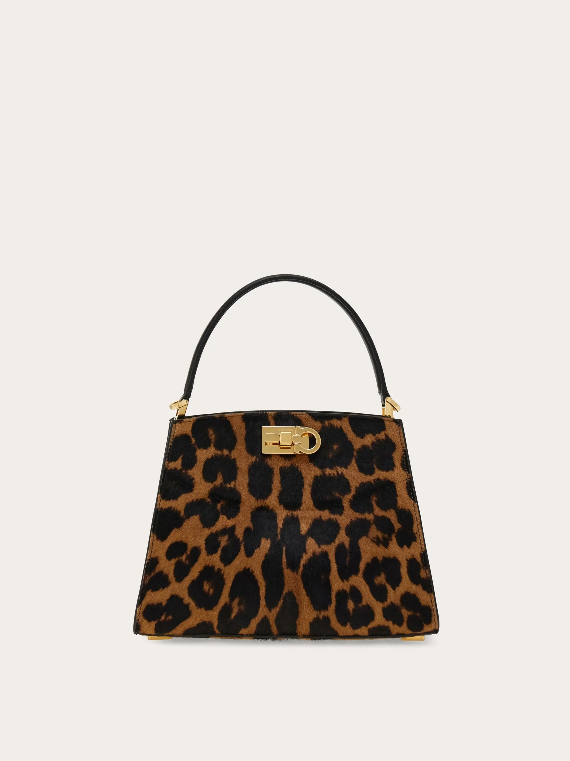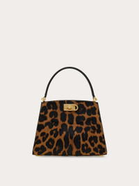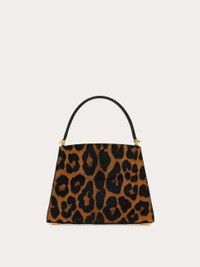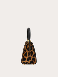 The Studio Box bag is given a bold look in all over animal print. True to the original silhouette, this compact iteration features the iconic Gancio slider clasp on the front panel in a golden hue, and a lined interior with two compartments with inner zip pocket. A removable cross body strap offers a hands-free styling option. - A) Height 7.2 IN B) Length 9.4 IN C) Width 4.7 IN - Composition: calfskin - Handle drop: 4.3 in/11 cm - Extra Small - Made in ITALY - Product code: 21A210 786133