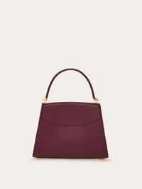 A compact edition of the ladylike Studio Box bag by Ferragamo. Cut from hammered calfskin leather with a refined, dappled texture, the rigid top handle enhances its uptown feel. The front panel is embellished with signature details: curved stitching and an iconic Hug buckle, and matching golden studs protect the base. Adjustable, removable shoulder strap. - A) Height 7.2 IN B) Length 9.4 IN C) Width 4.7 IN - Composition: hammered calfskin - Handle drop: 4.3 in/11 cm - Extra small - Made in ITALY - Product code: 21A210 789530