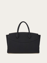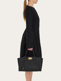A new edition to the Ferragamo Studio line, the Soft bag, cut from rich Italian calfskin. The dappled texture of the hammered leather echoes the sumptuous feel of this capacious accessory with ample slide bellows and tonal top handle. It fastens via a golden Gancio slider clasp, with tonal covered keyring for a playful note. Custom studs protect the base. Adjustable removable shoulder strap. - A) Height 9.4 IN B) Length 14.1 IN C) Width 6.4 IN - Composition: hammered calfskin - Handle drop: 4.7 in/12 cm - Large - Made in ITALY - Product code: 21A110 785995