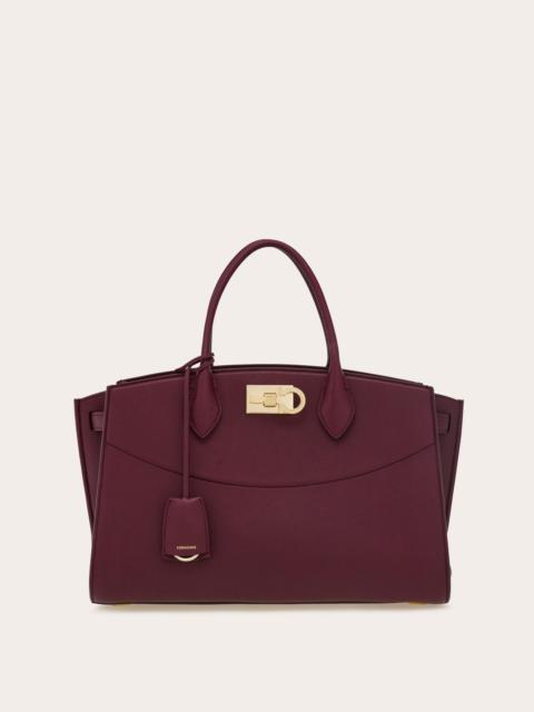 A new edition to the Ferragamo Studio line, the Soft bag, cut from rich Italian calfskin. The smooth texture of the calfskin leather echoes the sumptuous feel of this capacious accessory with ample slide bellows and tonal top handle. It fastens via a golden Gancio slider clasp, with tonal covered keyring for a playful note. Custom studs protect the base. Adjustable removable shoulder strap. - A) Height 9.4 IN B) Length 14.1 IN C) Width 6.4 IN - Composition: calfskin - Handle drop: 4.7 in/12 cm - Large - Made in ITALY - Product code: 21A110 789527