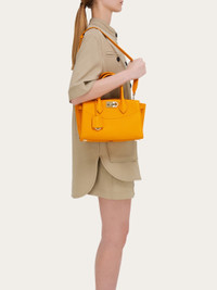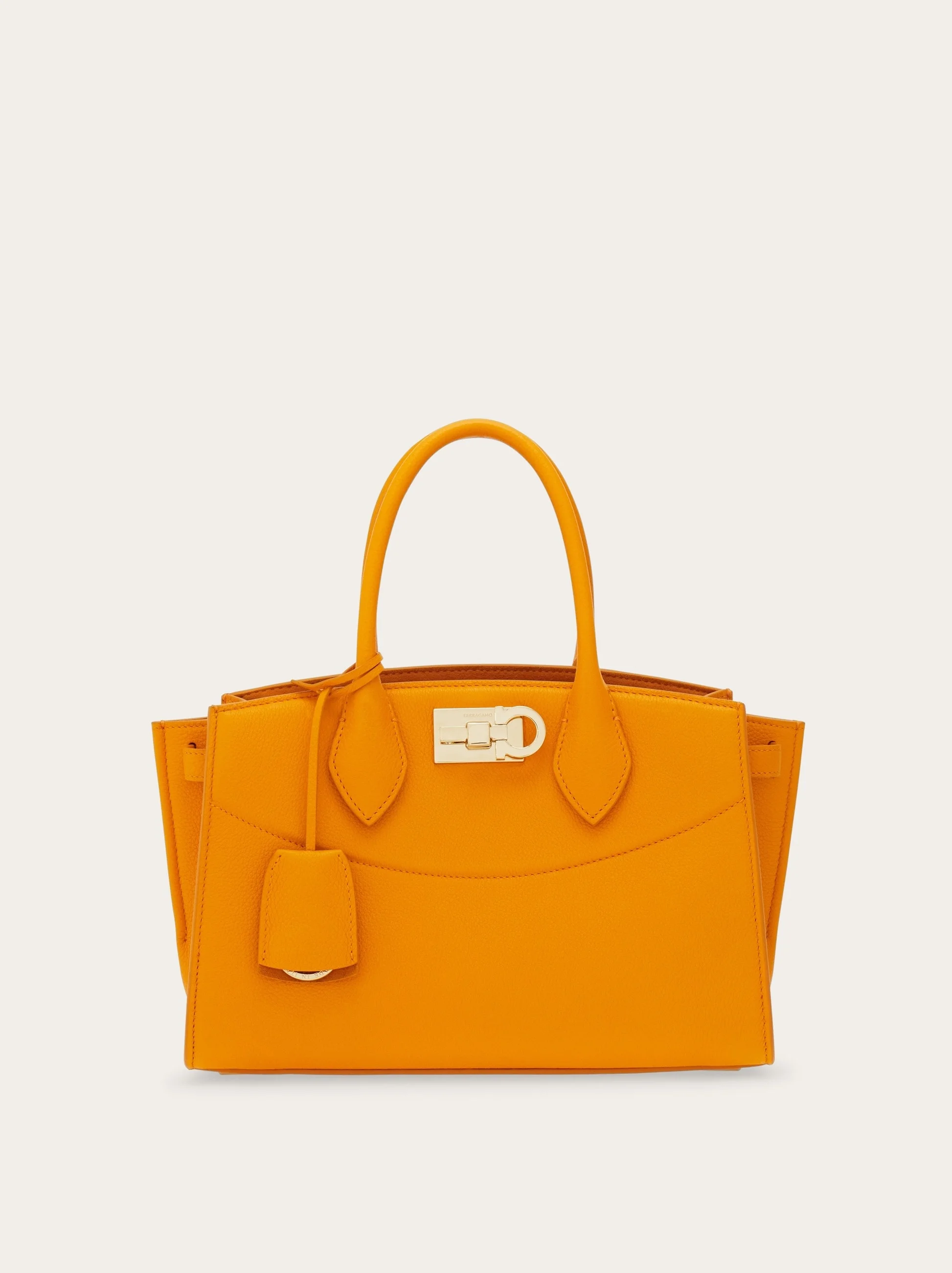 A new edition to the Ferragamo Studio line, the Soft bag, cut from rich Italian calfskin. The dappled texture of the hammered leather echoes the sumptuous feel of this capacious accessory with ample slide bellows and tonal top handle. The suede lined interior fastens via an iconic Gancio slider clasp, with tonal covered keyring for a playful note. Custom studs protect the base. Adjustable removable shoulder strap. - A) Height 7.2 IN B) Length 11.0 IN C) Width 4.9 IN - Composition: hammered calfskin - Handle drop: 4.3 in/11 cm - Medium - Made in ITALY - Product code: 21A112 786169
