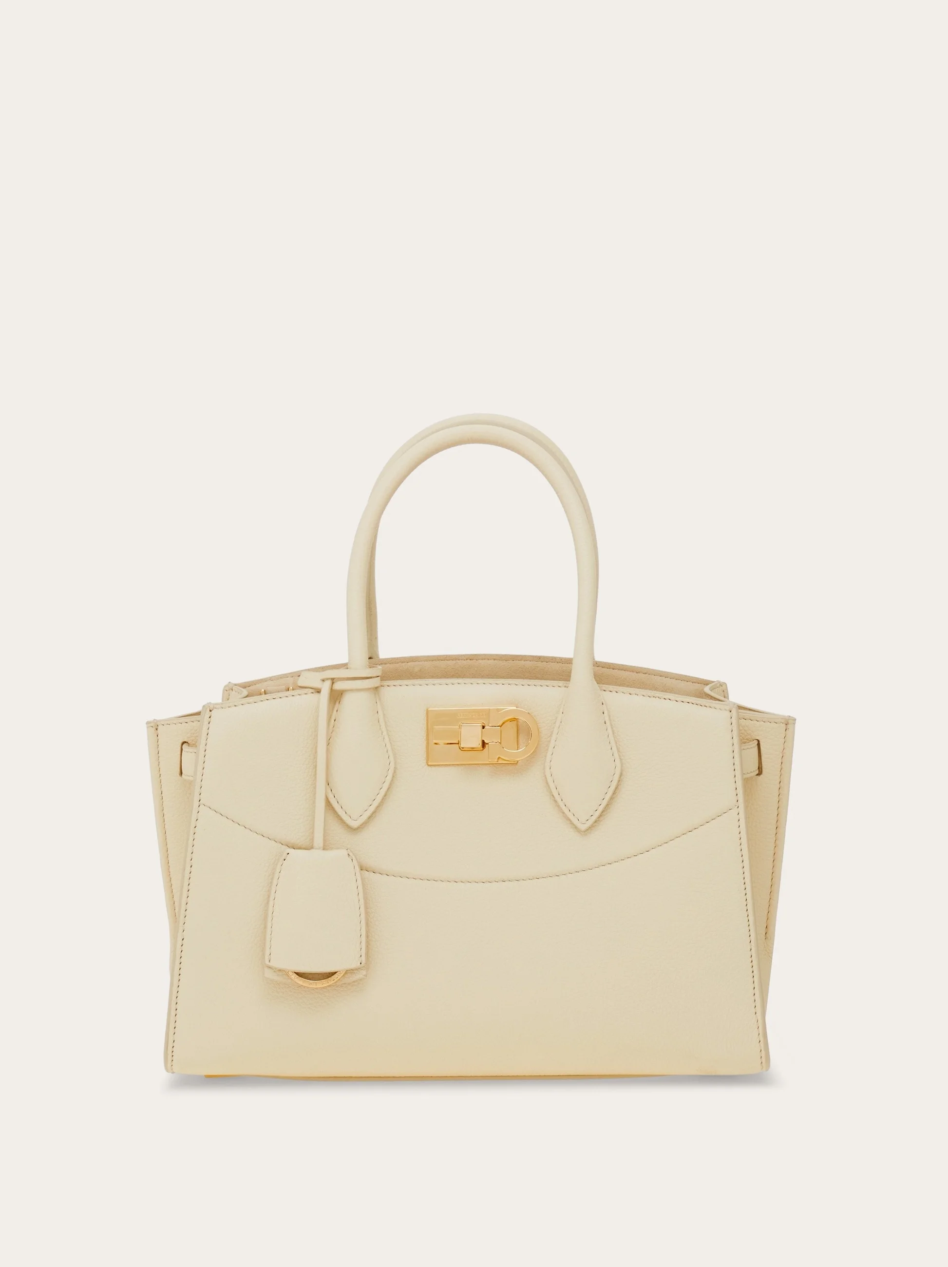 A new edition to the Ferragamo Studio line, the Soft bag, cut from rich Italian calfskin. The dappled texture of the hammered leather echoes the sumptuous feel of this capacious accessory with ample slide bellows and tonal top handle. The suede lined interior fastens via an iconic Gancio slider clasp, with tonal covered keyring for a playful note. Custom studs protect the base. Adjustable removable shoulder strap. - A) Height 7.2 IN B) Length 11.0 IN C) Width 4.9 IN - Composition: hammered calfskin - Handle drop: 4.3 in/11 cm - Medium - Made in ITALY - Product code: 21A112 786170