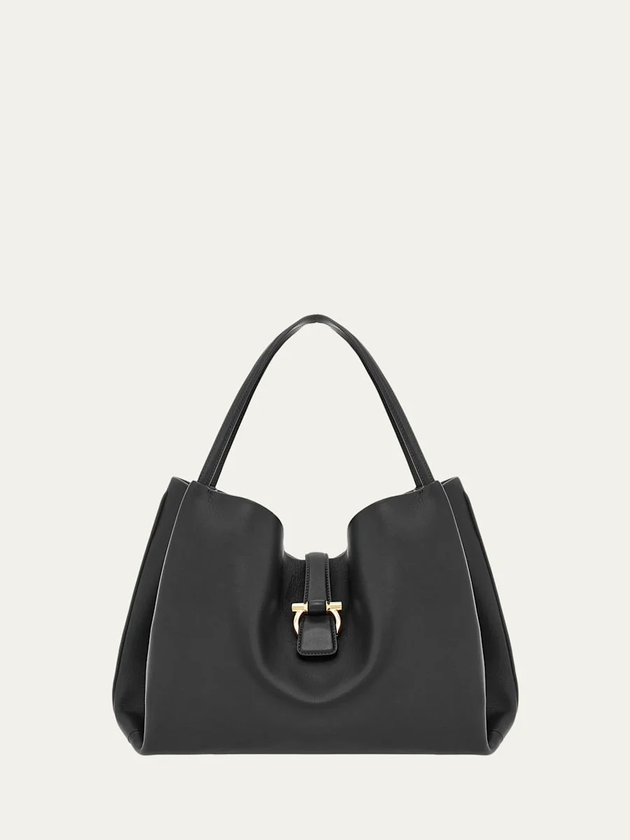 Ferragamo leather tote bag Shoulder strap, 9.4" drop Open top with Gancini clasp closure Interior, one zip pocket Lining: Leather Approx. 10.2"H x 14.9"W x 6.6"D Professional cleaning recommended, spot clean Made in Italy