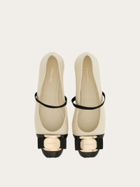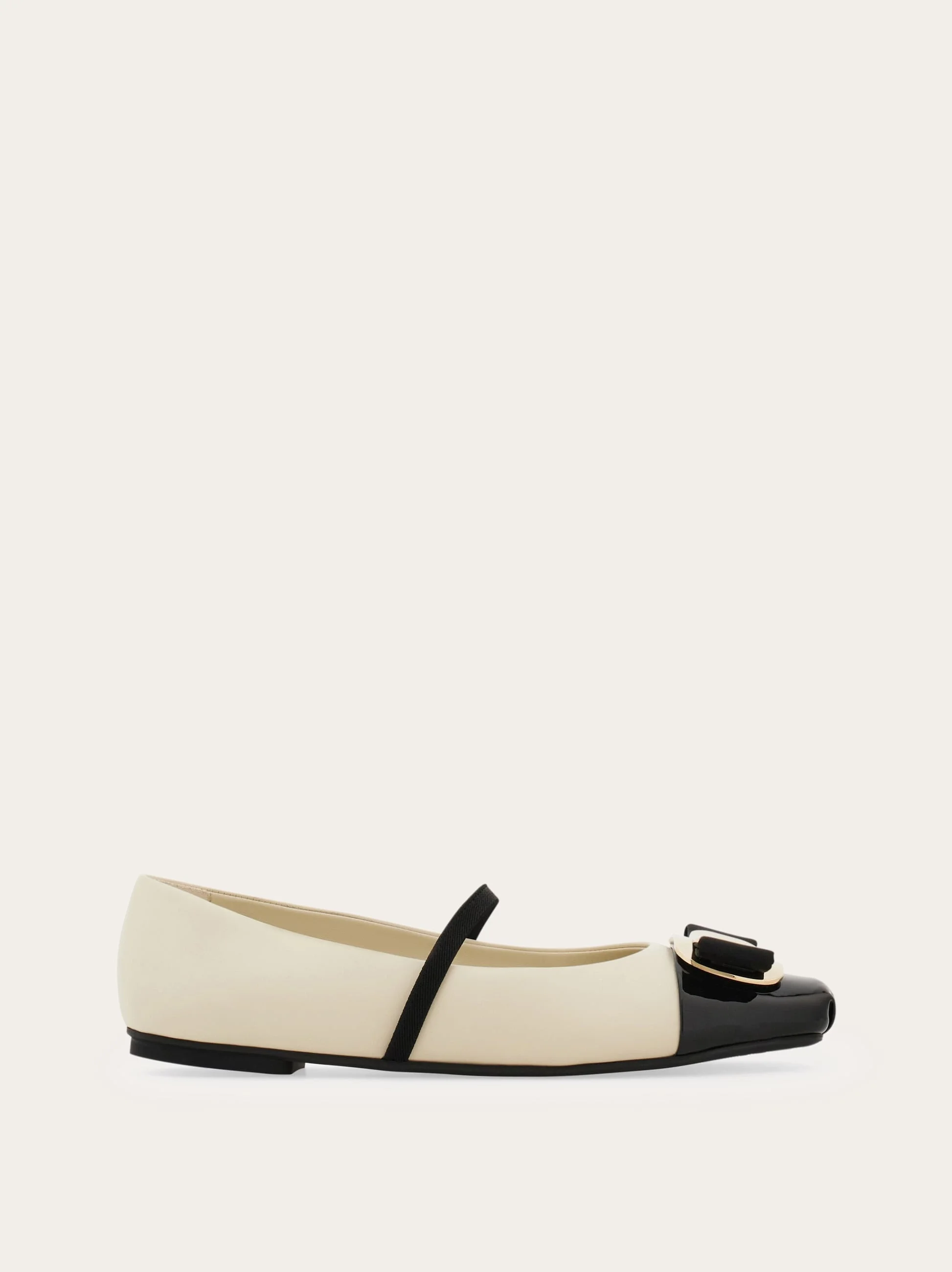 Inspired by a classic, this contemporary ballet flat features a super soft bicolor leather upper with ruffles at the pointed tip just like their namesake. The gros grain elastic across the upper duets with Vara bow held by the new Ferragamo buckle at the toe. Knurled rubber flexible sole. - height 0.1 IN - Composition: nappa - Made in ITALY - Product code: 01J183 777437